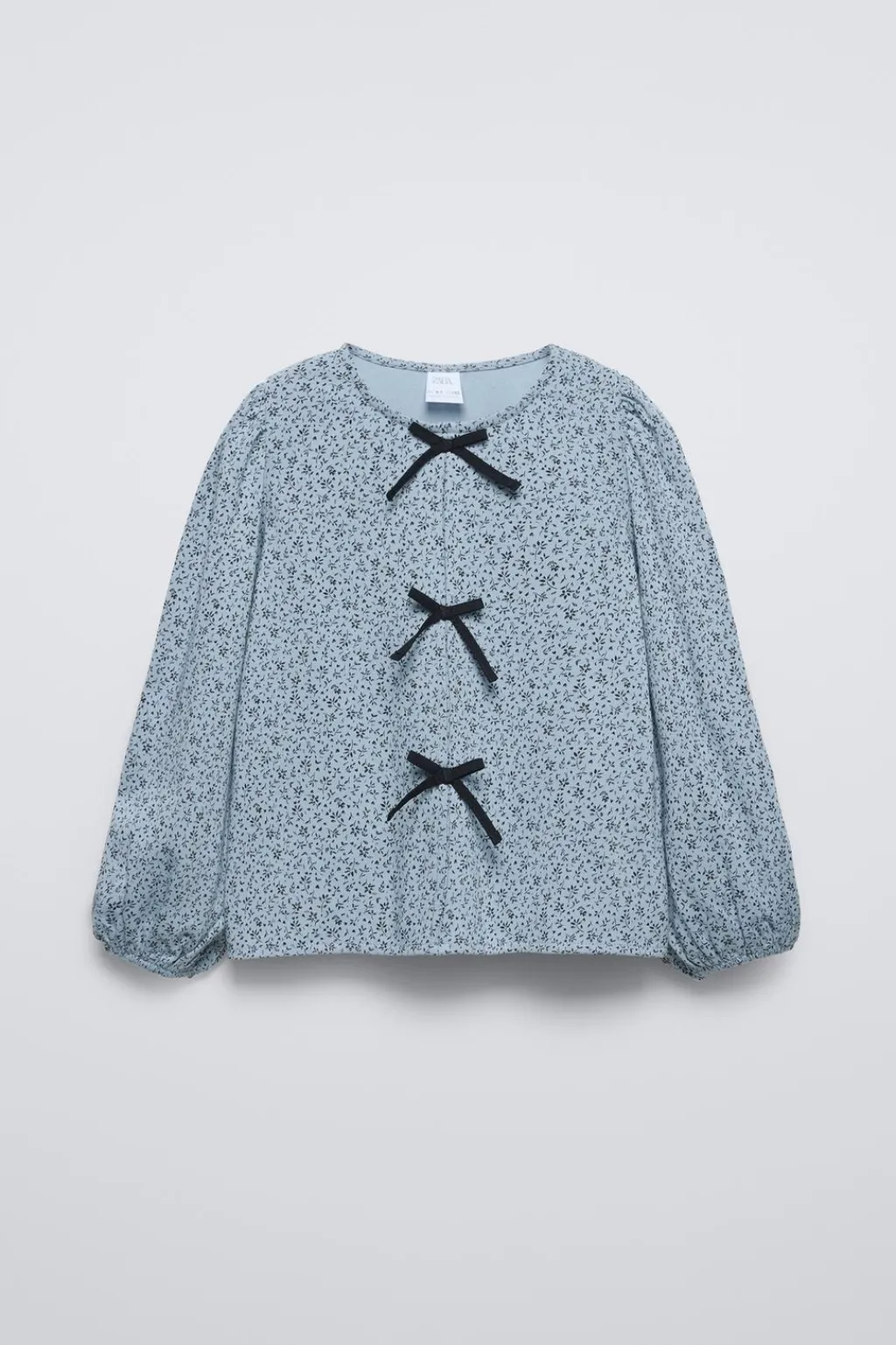Camiseta con cuello redondo y manga larga acabada en goma. Aplique lazos en delantero.