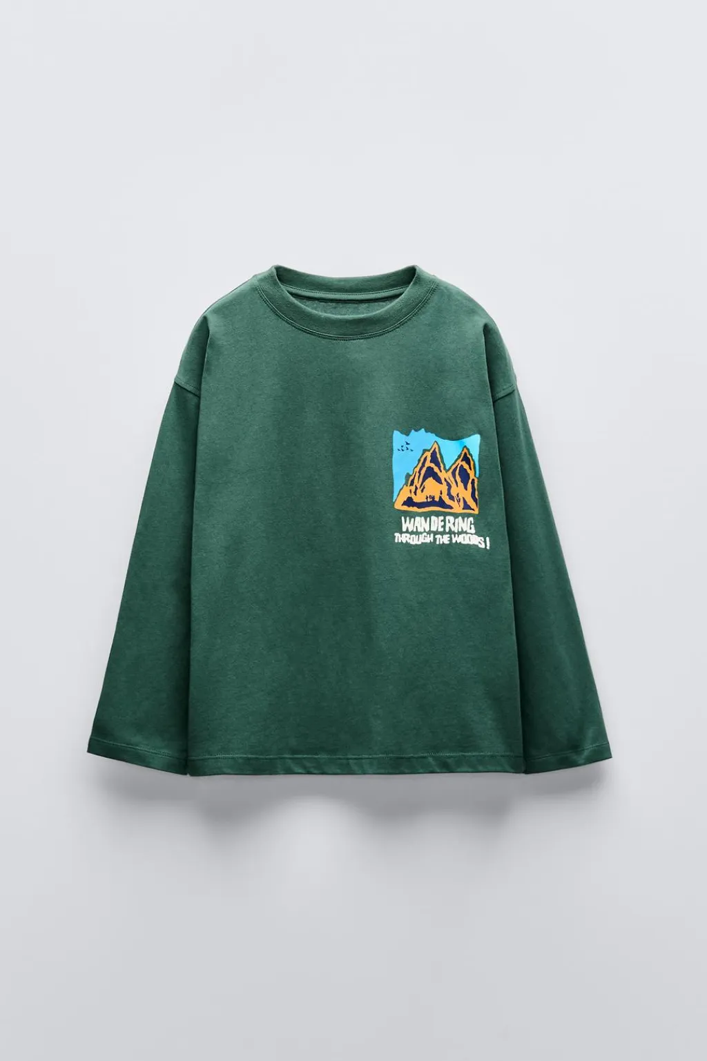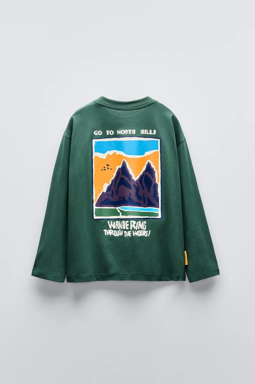 Camiseta con cuello redondo y manga larga. Estampado montañas en pechera y espalda. Aplique etiqueta en lateral.
