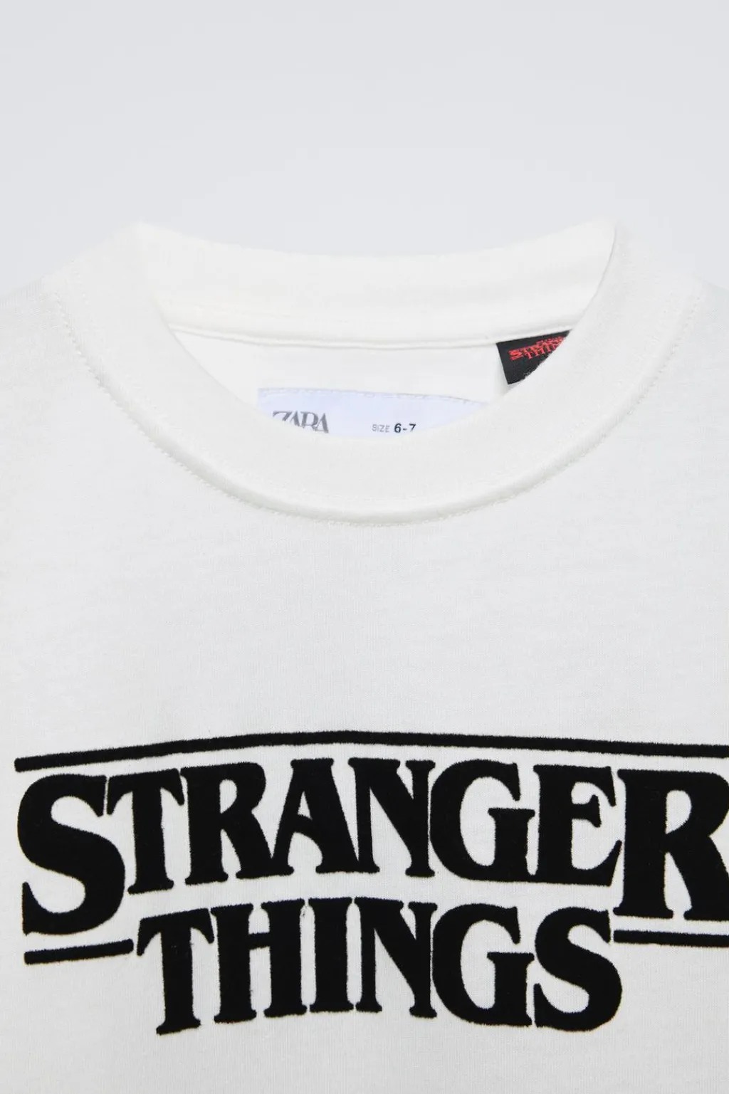 Camiseta con cuello redondo y manga corta. Estampado con detalle flock STRANGER THINGS ™/ © NETFLIX en delantero y espalda. Aplique etiqueta en bajo.