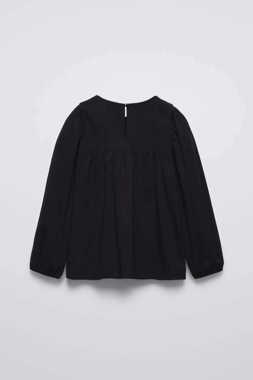 Camiseta con cuello redondo y manga larga acabada en goma. Cierre tipo lágrima con botón en espalda. Detalle bordados en pechera.