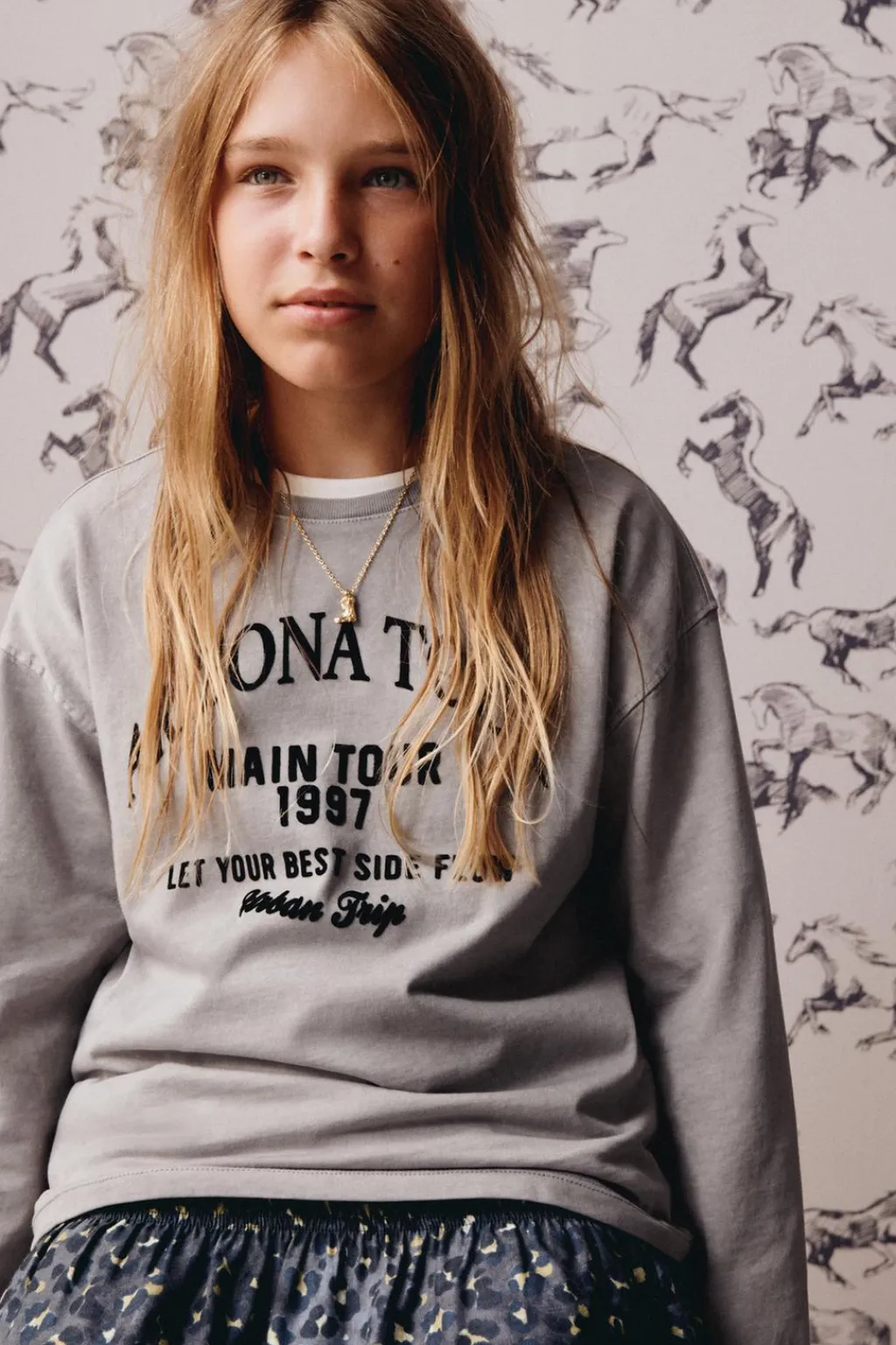 Camiseta con cuello redondo y manga larga. Estampado texto con flock en delantero.