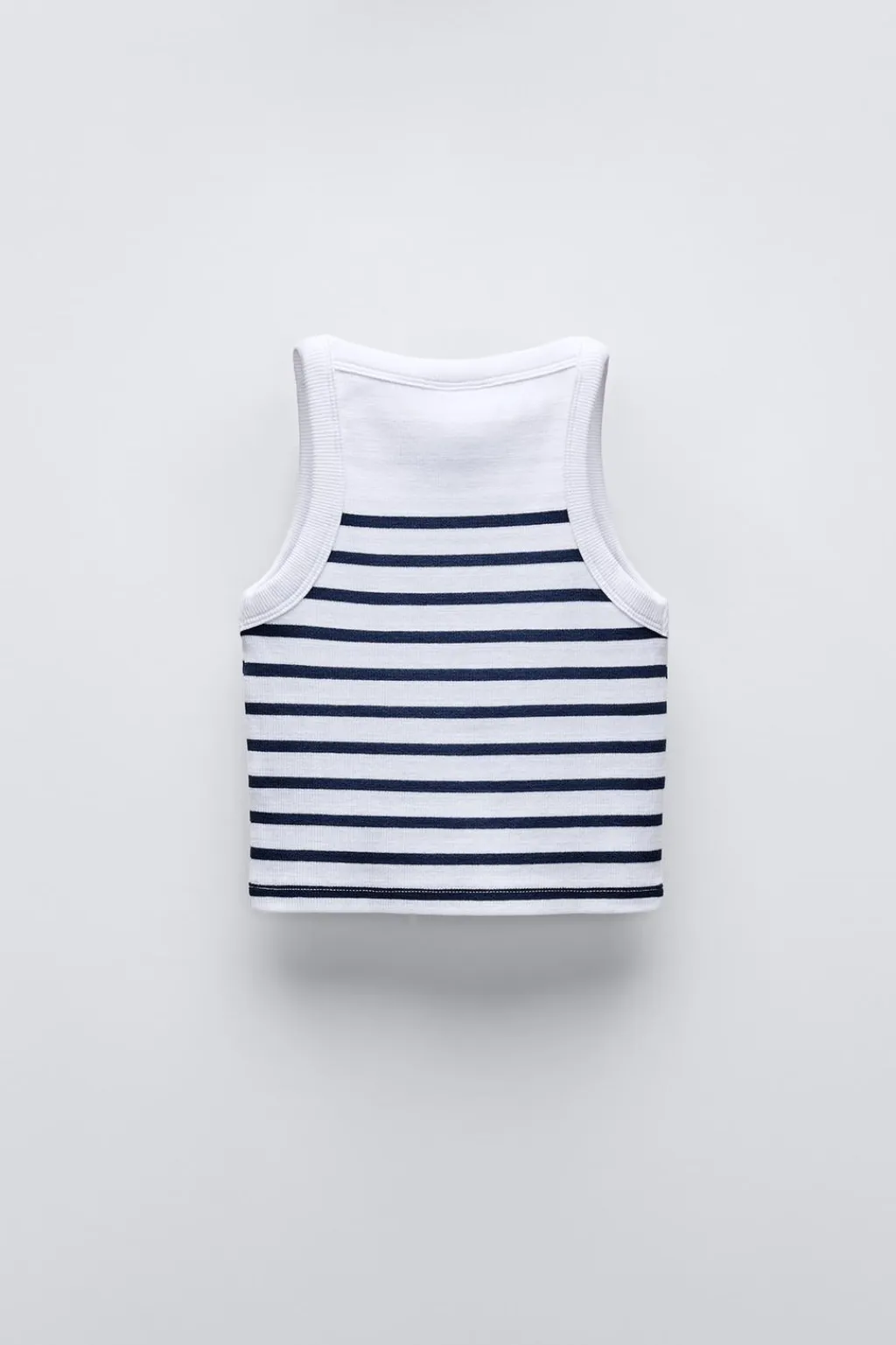 Camiseta tipo top con cuello redondo y sin mangas. Estampado rayas.