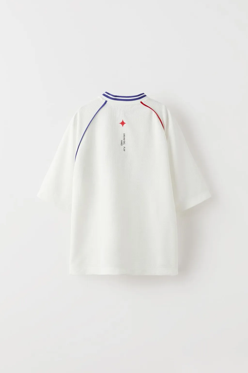 Camiseta con cuello pico y manga corta. Estampado en delantero. Detalle vivos color a contraste.