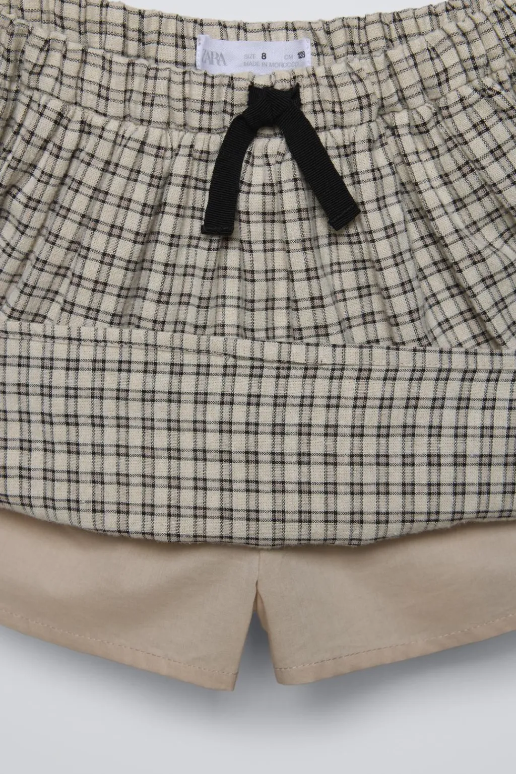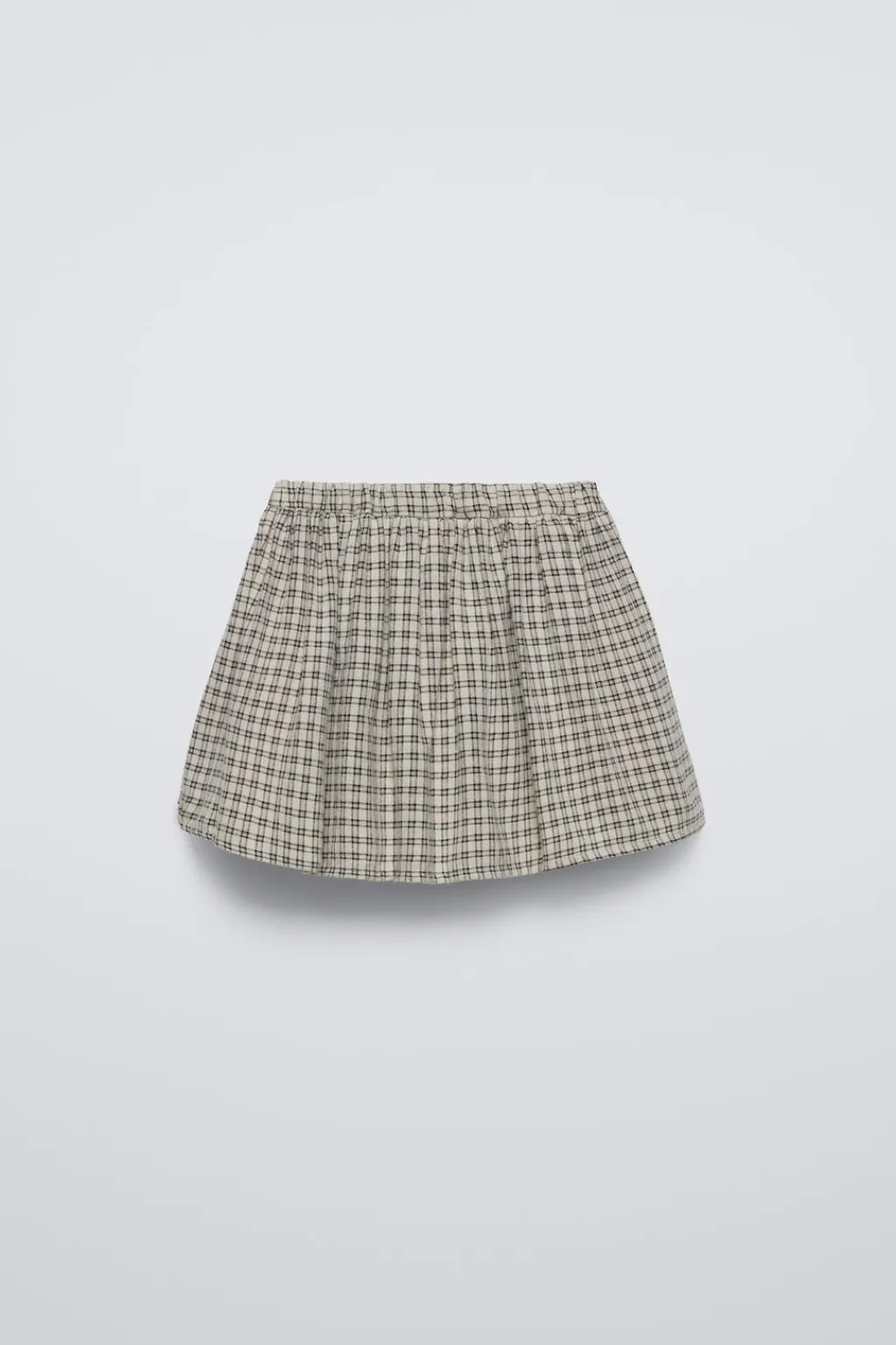 Falda tipo bermuda con cinturilla elástica y aplique cordones en frontal. Estampado cuadros.