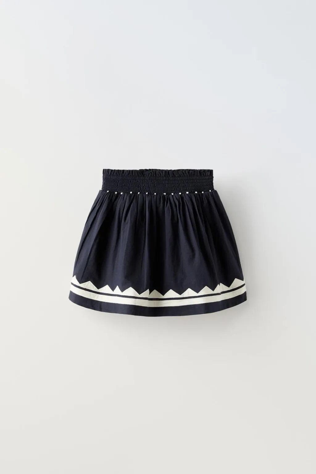 Falda con cinturilla elástica con aplique perlitas. Detalle bordados en bajo.