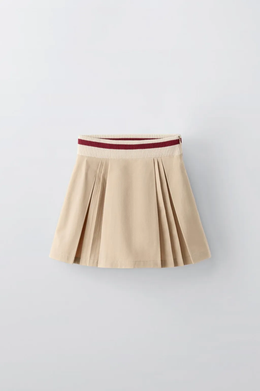 Falda con cinturilla elástica en rib y cierre de cremallera en lateral oculta por costura. Detalle tablas.