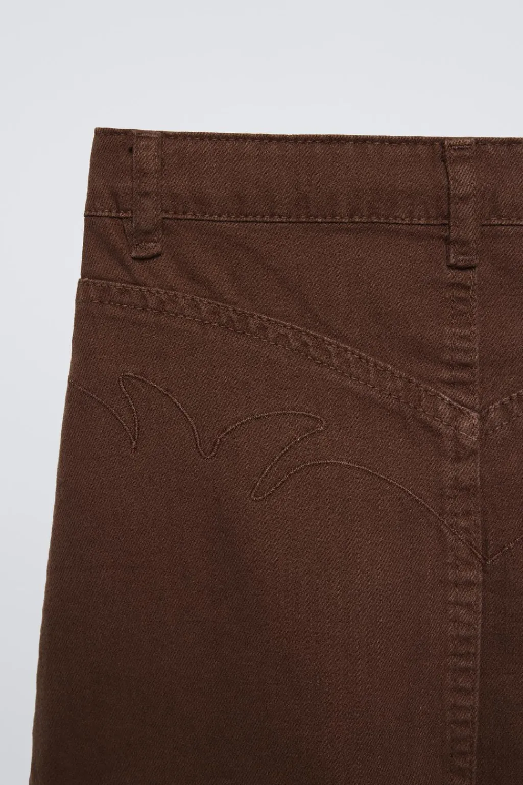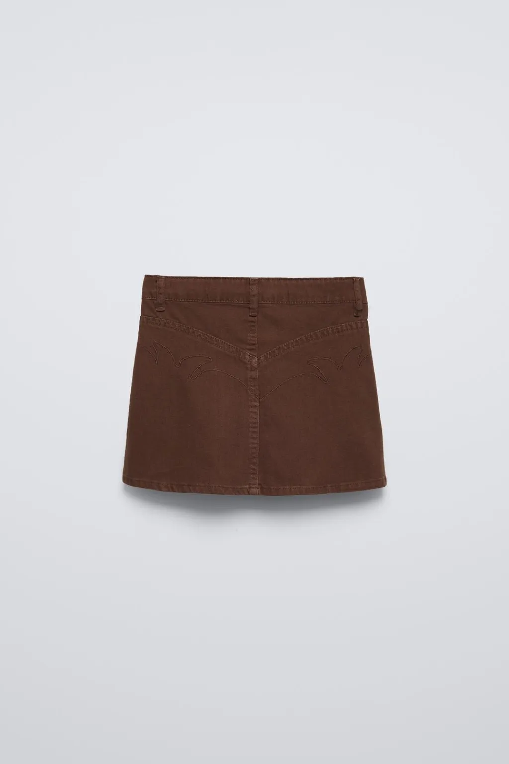 Falda con cinturilla interior ajustable y cierre botón frontal. Bolsillos delanteros y aplique tachas.