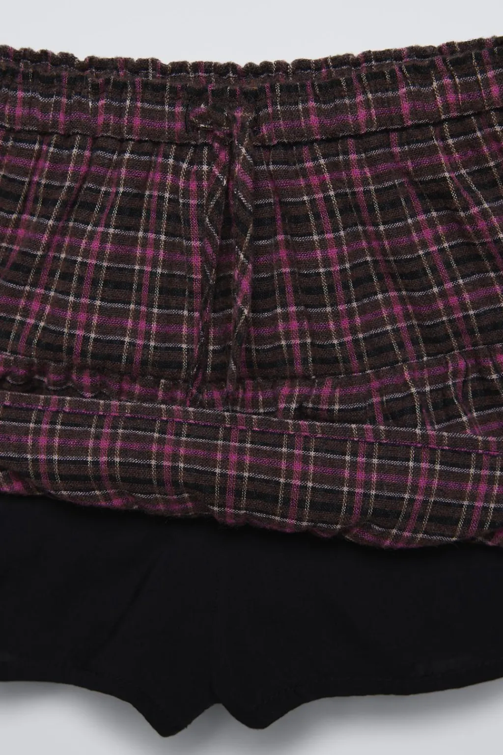 Falda tipo bermuda con cinturilla elástica y aplique cordones. Detalle volantes.