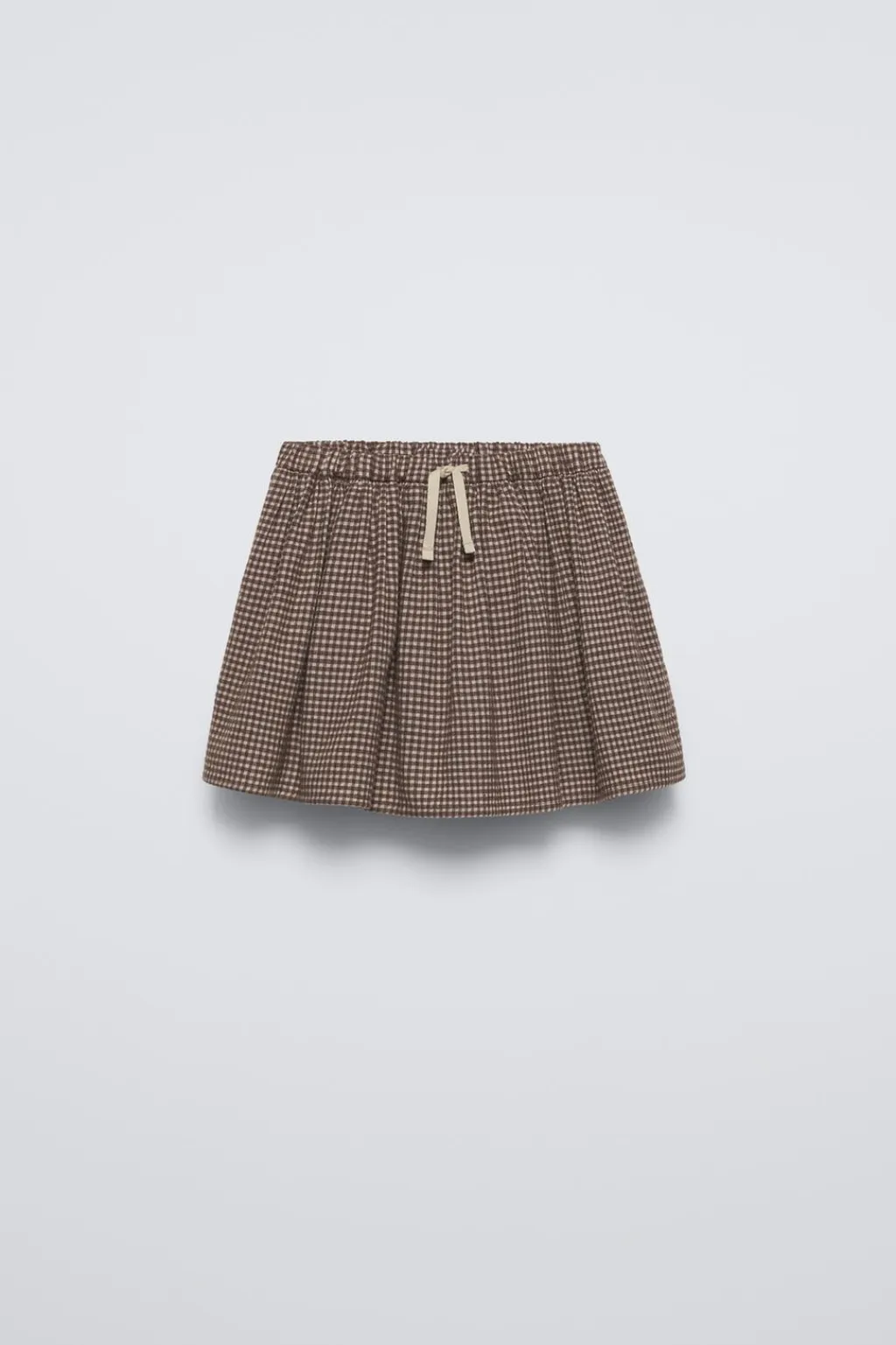 Falda tipo bermuda con cinturilla elástica y aplique cordones en frontal. Estampado cuadros.