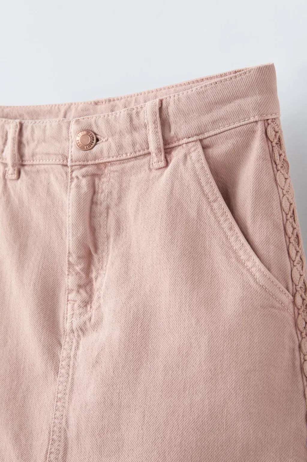 Falda con cinturilla interior elástica y cierre botón frontal. Bolsillos en delantero y tipo plastrón en espalda. Aplique trenza color a tono en latererales.
