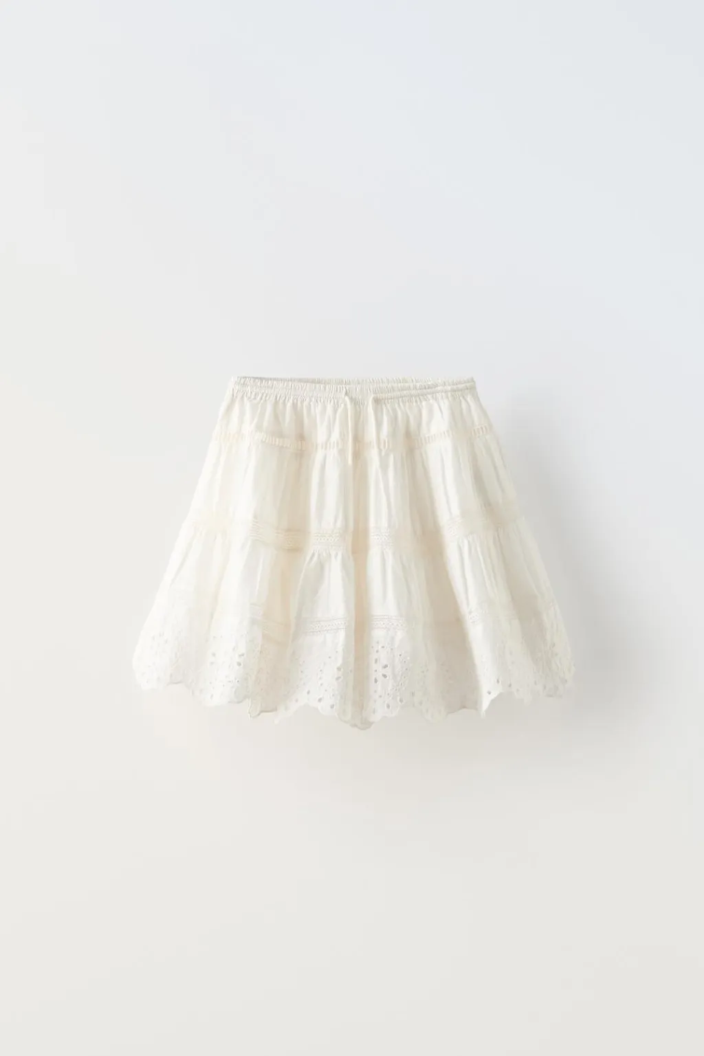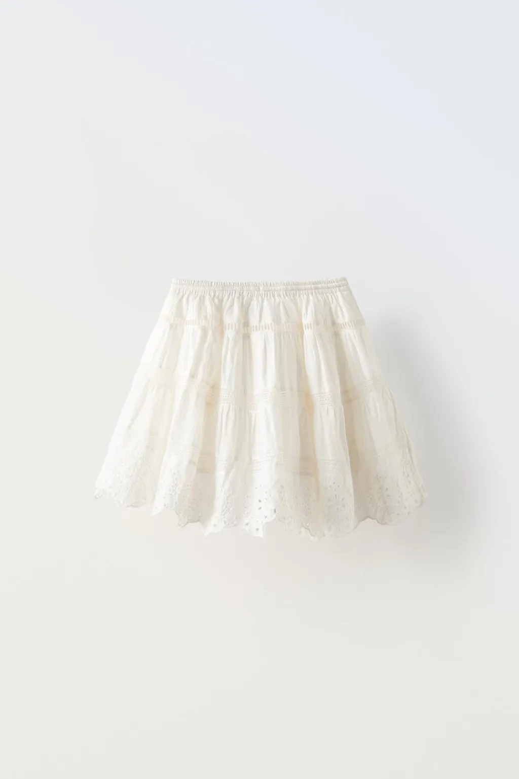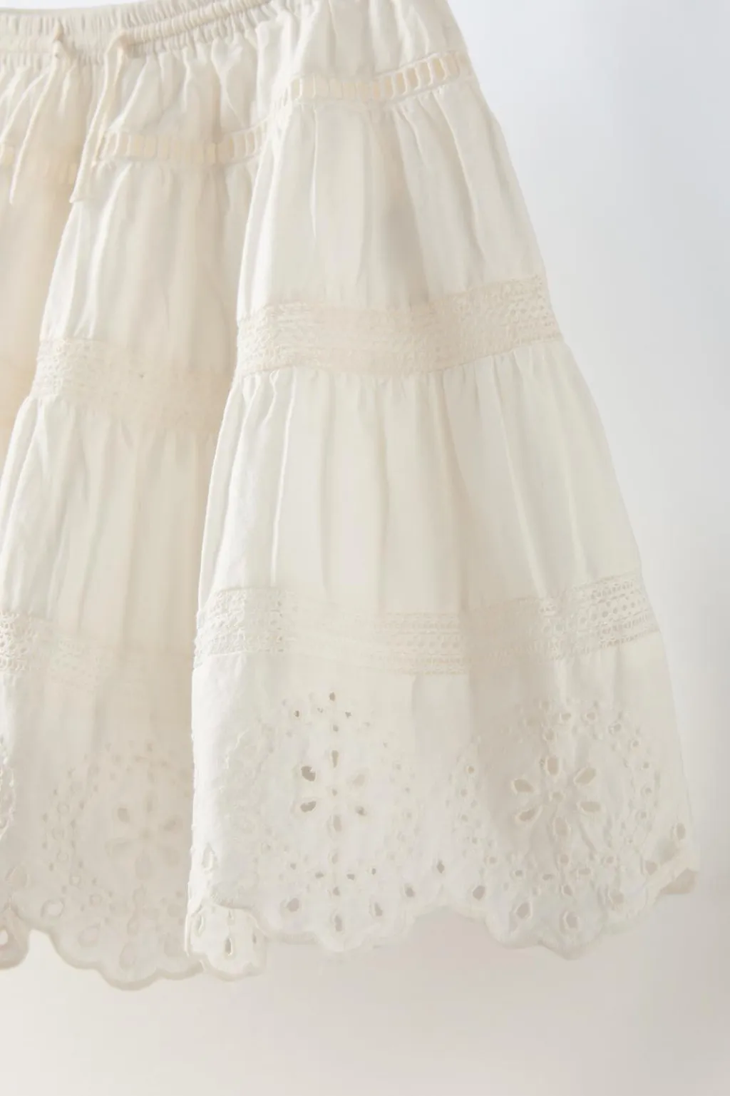 Falda con cinturilla elástica y cordones ajustables. Detalle entredos en delantero y espalda. Bordados en el bajo.