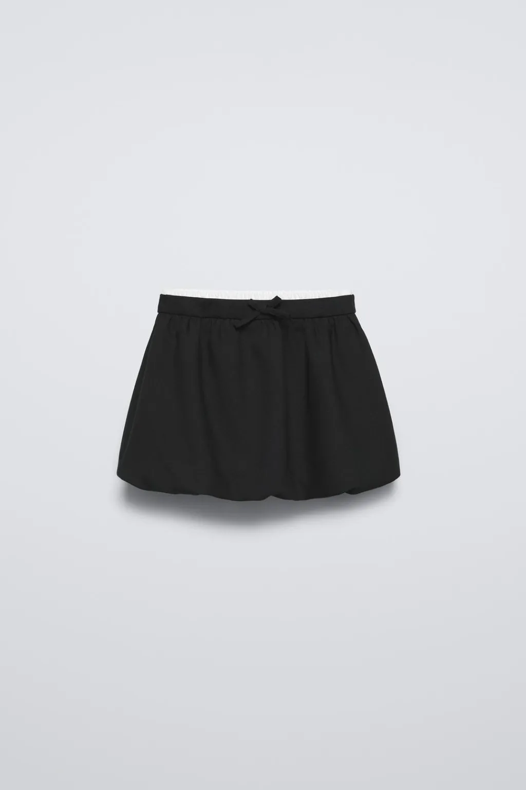 Falda con doble cinturilla elástica y aplique lazo frontal. Bajo acabado en globo con goma.