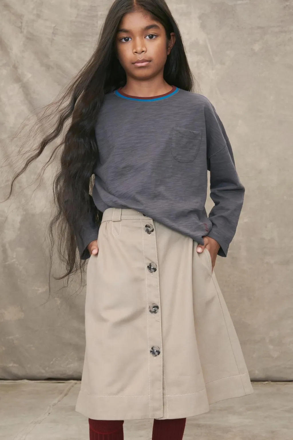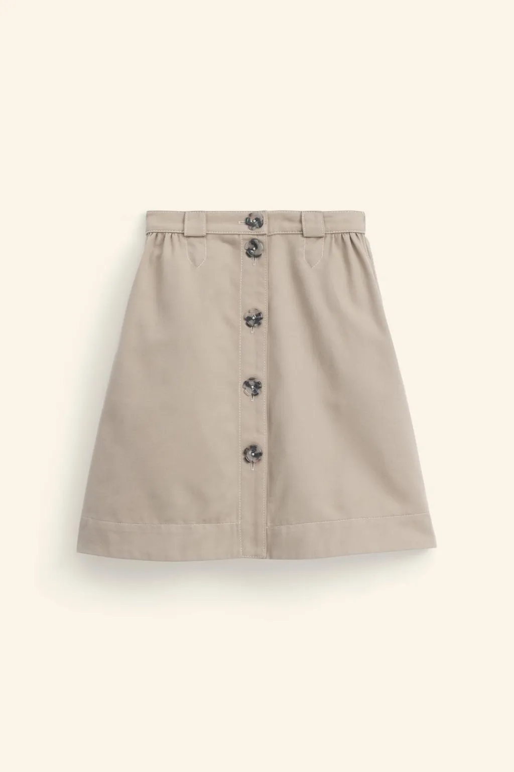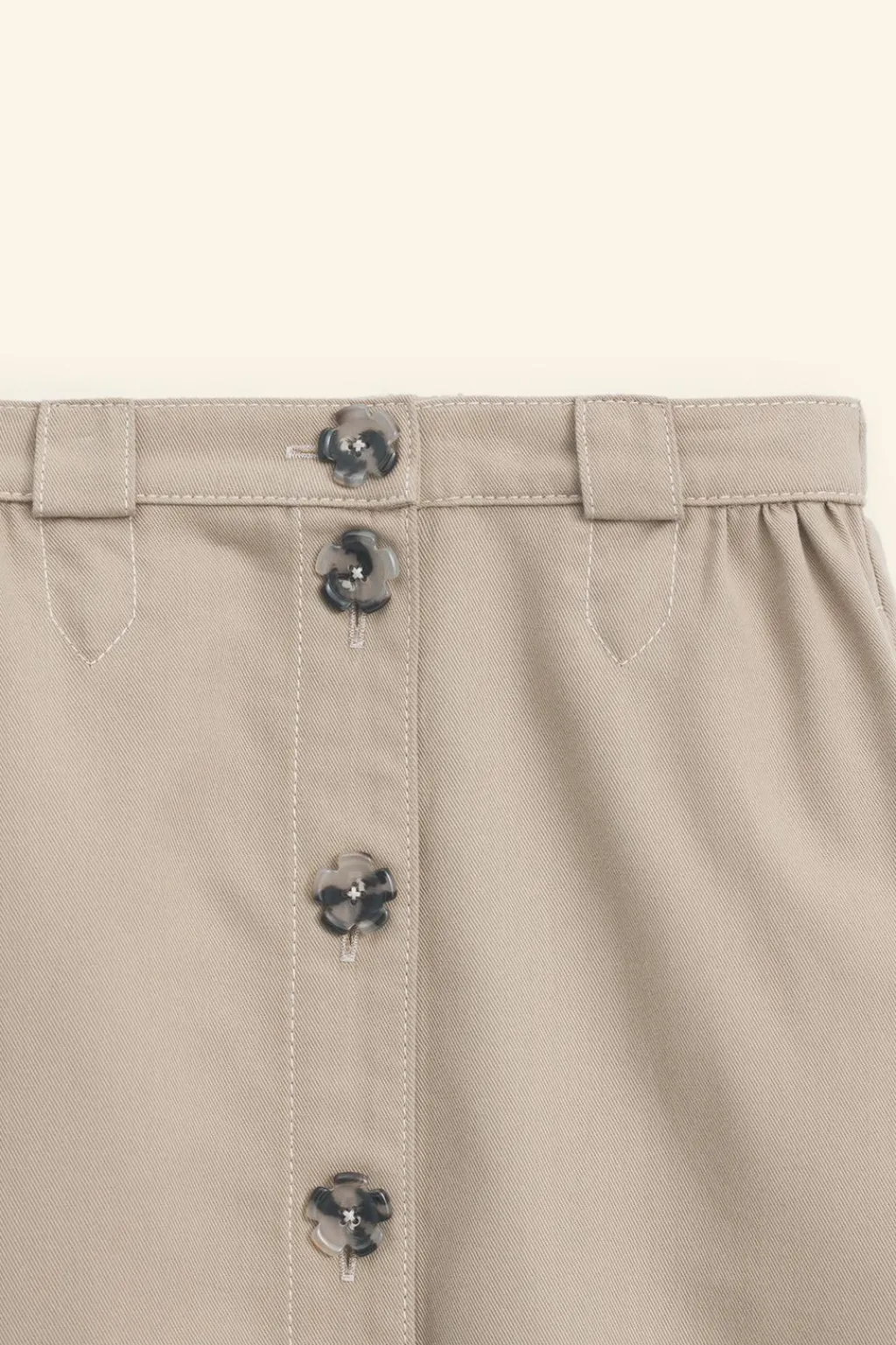 Falda tipo midi con cinturilla elástica en espalda y cierre botonadura frontal en forma de flor. Bolsillos en delantero.
