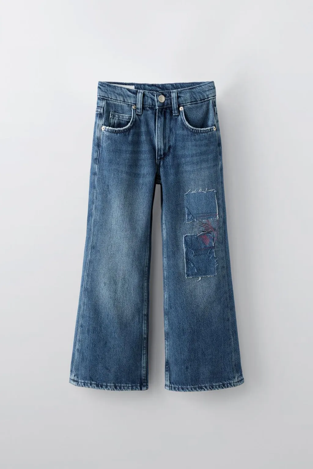 Jeans tipo flare con cinturilla interior ajustable y cierre botón frontal. Bolsillos delanteros y de tipo plastrón en espalda. Detalle parches.