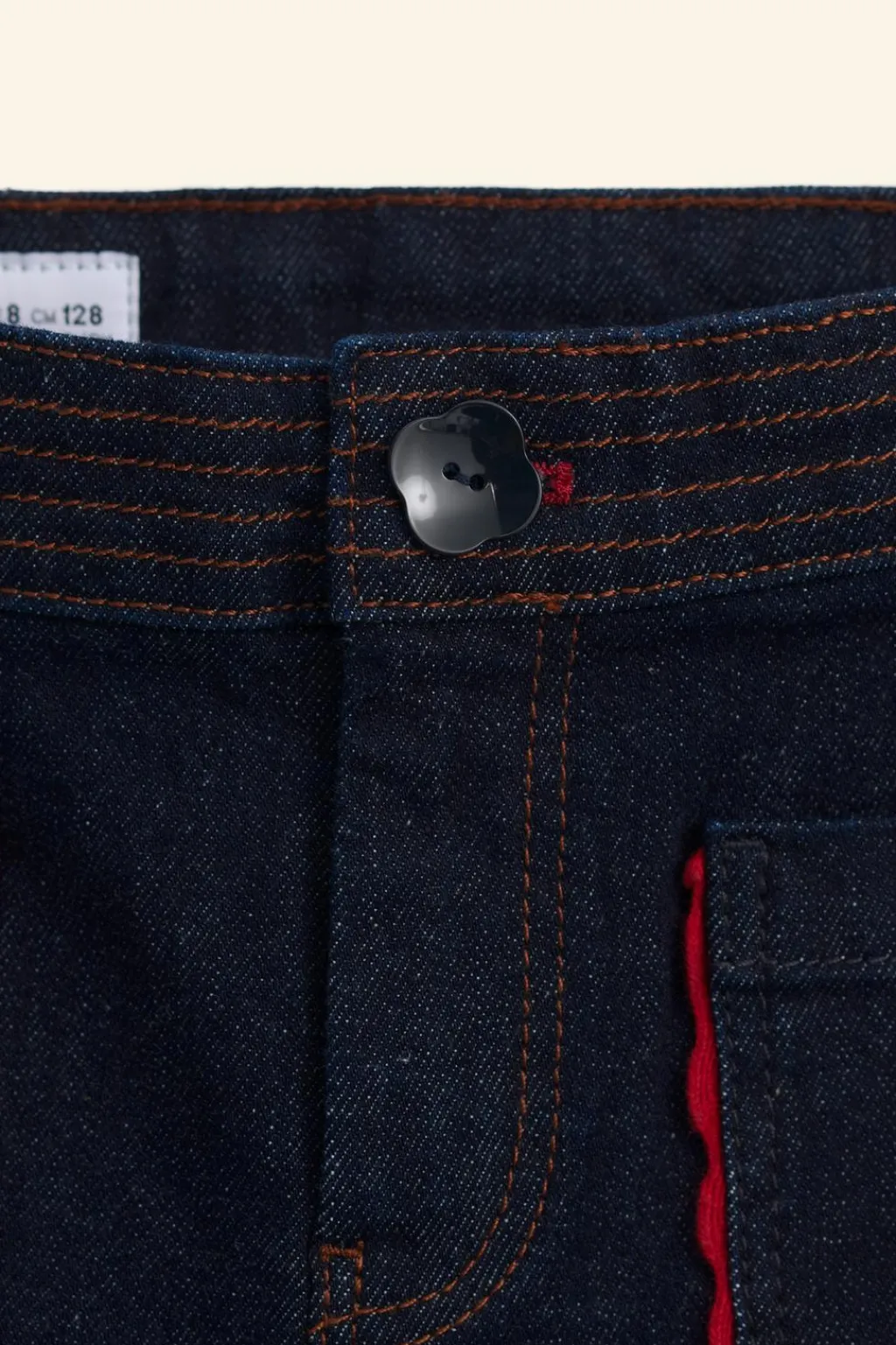 Jeans tipo flare con cinturilla interior ajustable y cierre botón frontal en forma de flor. Bolsillos de tipo plastrón en delantero con aplique ondas a contraste.
