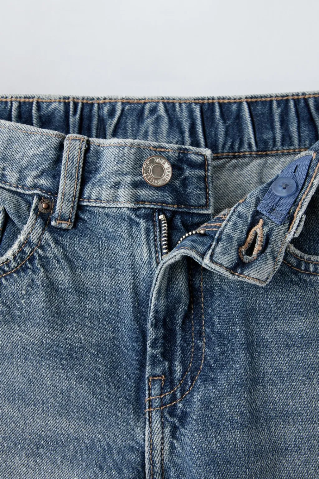 Jeans mom fit con cinturilla elástica y cierre botón frontal. Bolsillos en delantero y tipo plastrón en espalda.