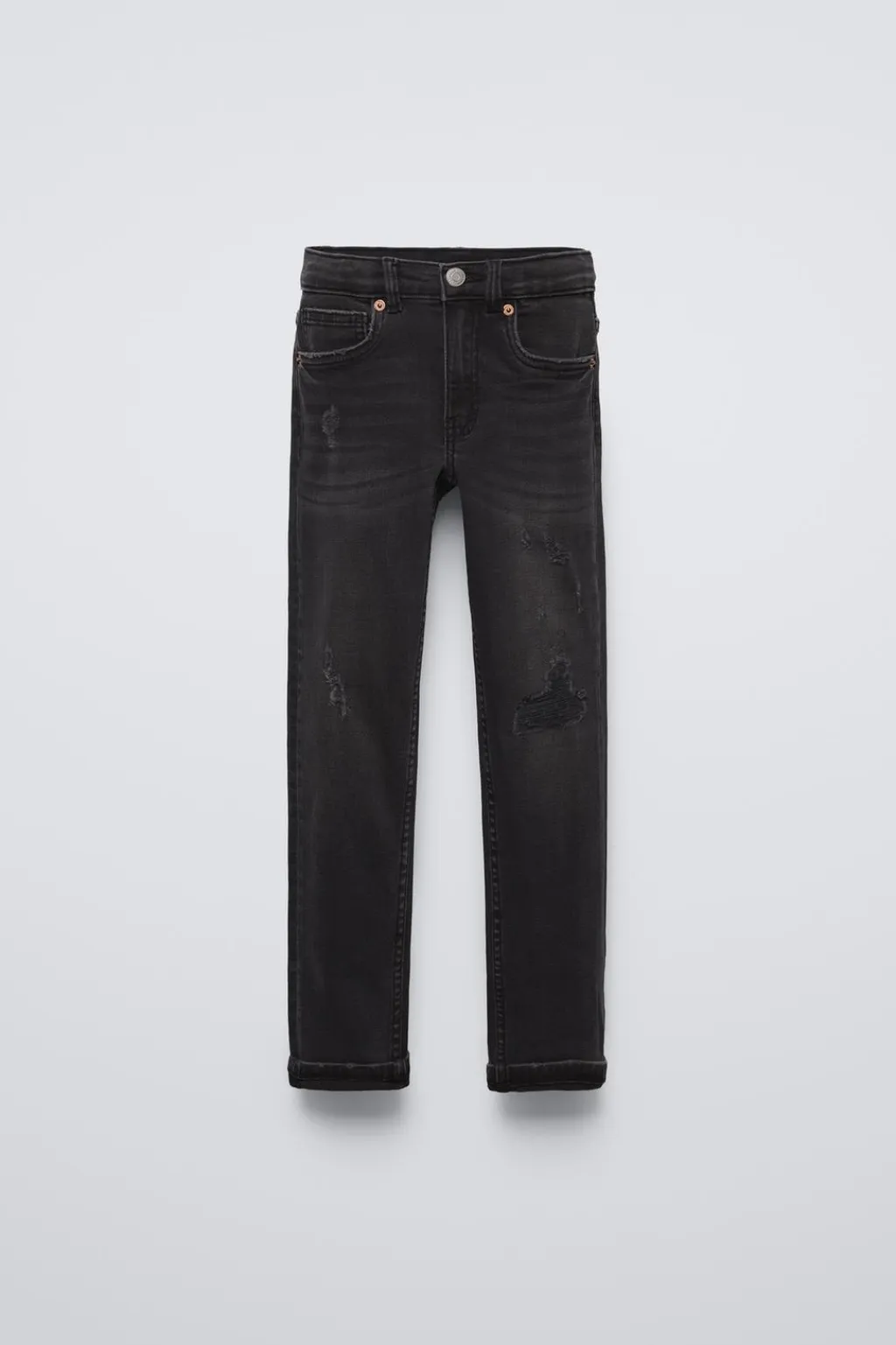 Jeans tipo skinny con cinturilla interior ajustable y cierre botón frontal. Cierre botón tipo presión en la talla 6. Bolsillos delanteros y de tipo palstrón en espalda. Bajo acabado en vuelta. Detalle rotos.