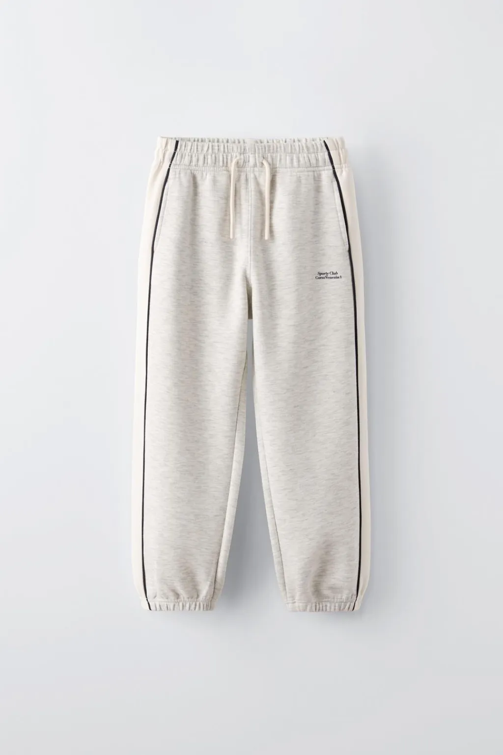Pantalón con cinturilla elástica y aplique cordones. Estampado texto en pernera. Bolsillos en delantero. Detalle banda con vivo color a contraste en laterales. Bajo acabado en goma.