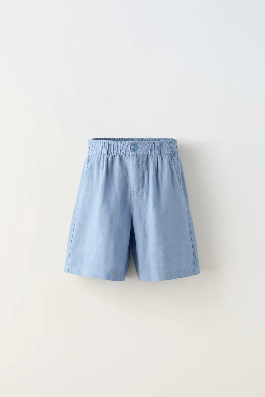 Bermuda con un tejido 100% de lino, cinturilla elástica y cierre botón frontal. Bolsillos delanteros y de tipo plastrón en espalda.