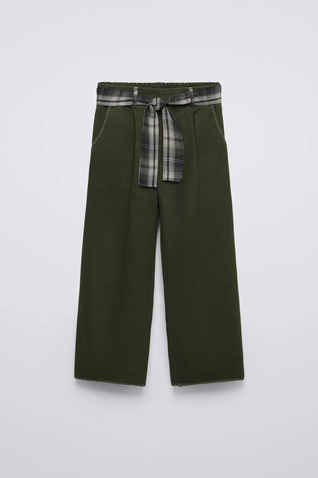 Pantalón con cinturilla elástica en espalda y cierre frontal. Aplique cinturón lazo con estampado cuadros. Bolsillos delanteros y de tipo plastrón en espalda. Detalle acabado en puntilla en bajo y bolsillos.