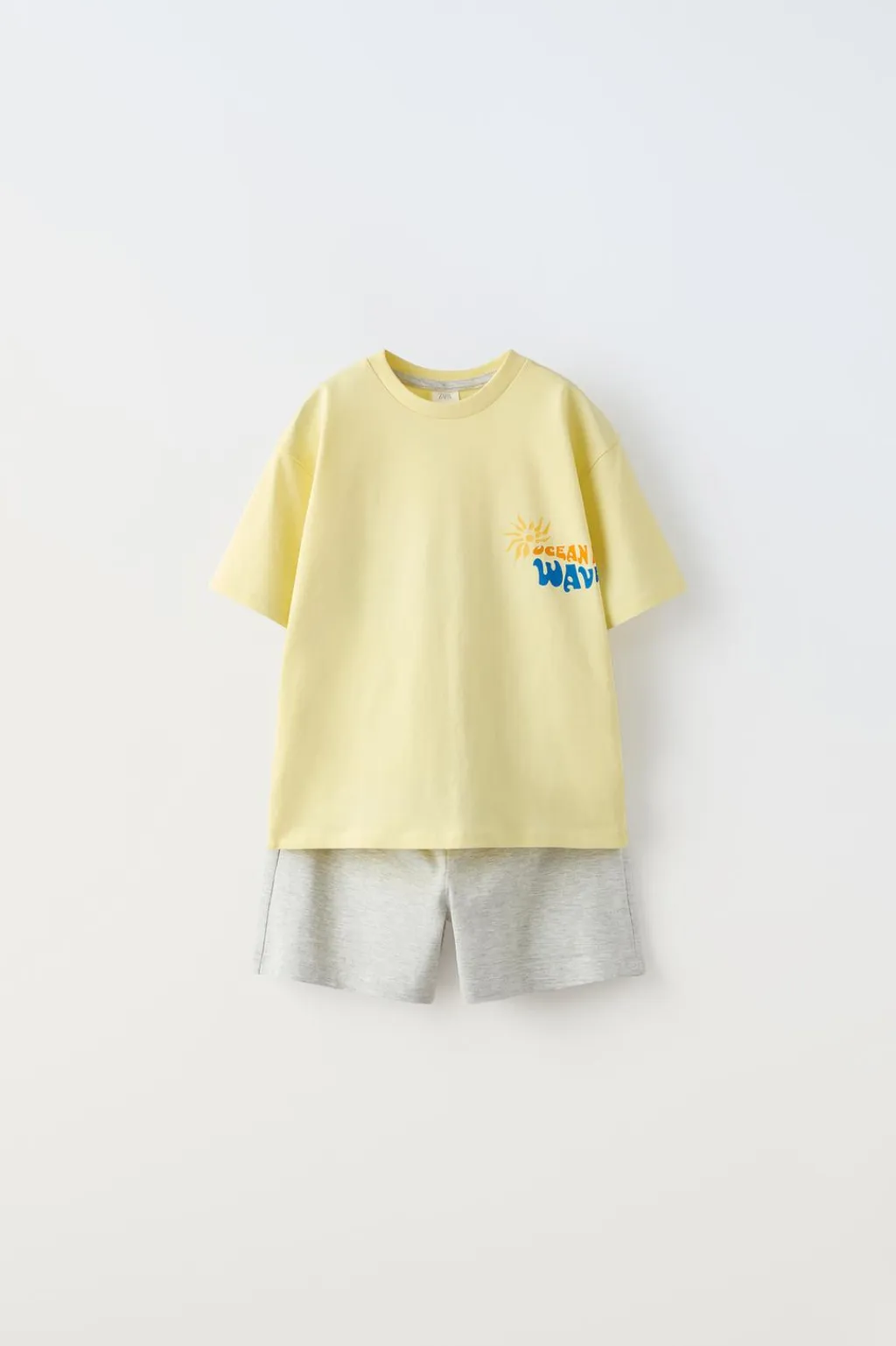 Pijama de dos piezas. Camiseta con cuello redondo y manga corta. Estampado en delantero y espalda. Bermuda con cinturilla elástica y cordones ajustables en color a contraste.
