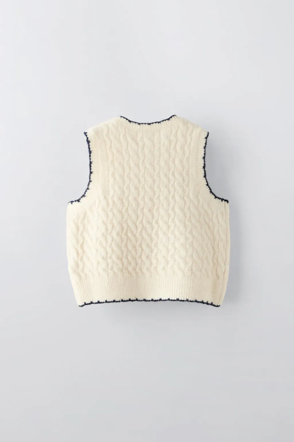 Chaleco con cuello redondo y manga sisa. Acabados a contraste. Aplique con abalorios en bajo.