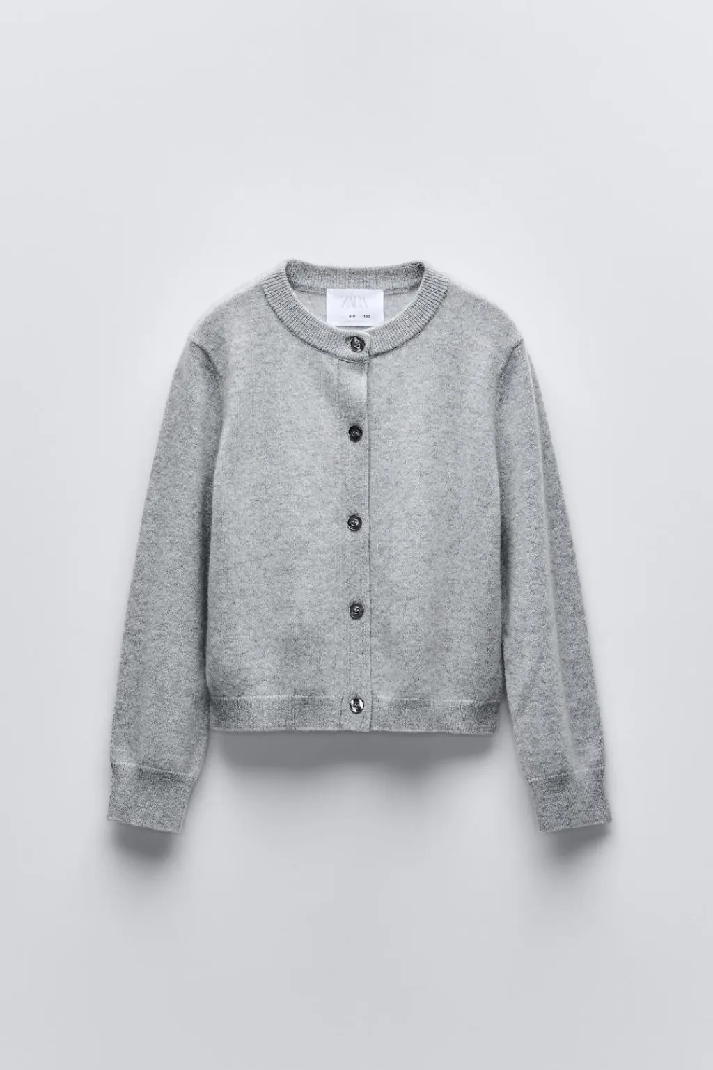 Chaqueta con cuello redondo y manga larga. Cierre botonadura frontal. Tejido con un 100% de cashmere.