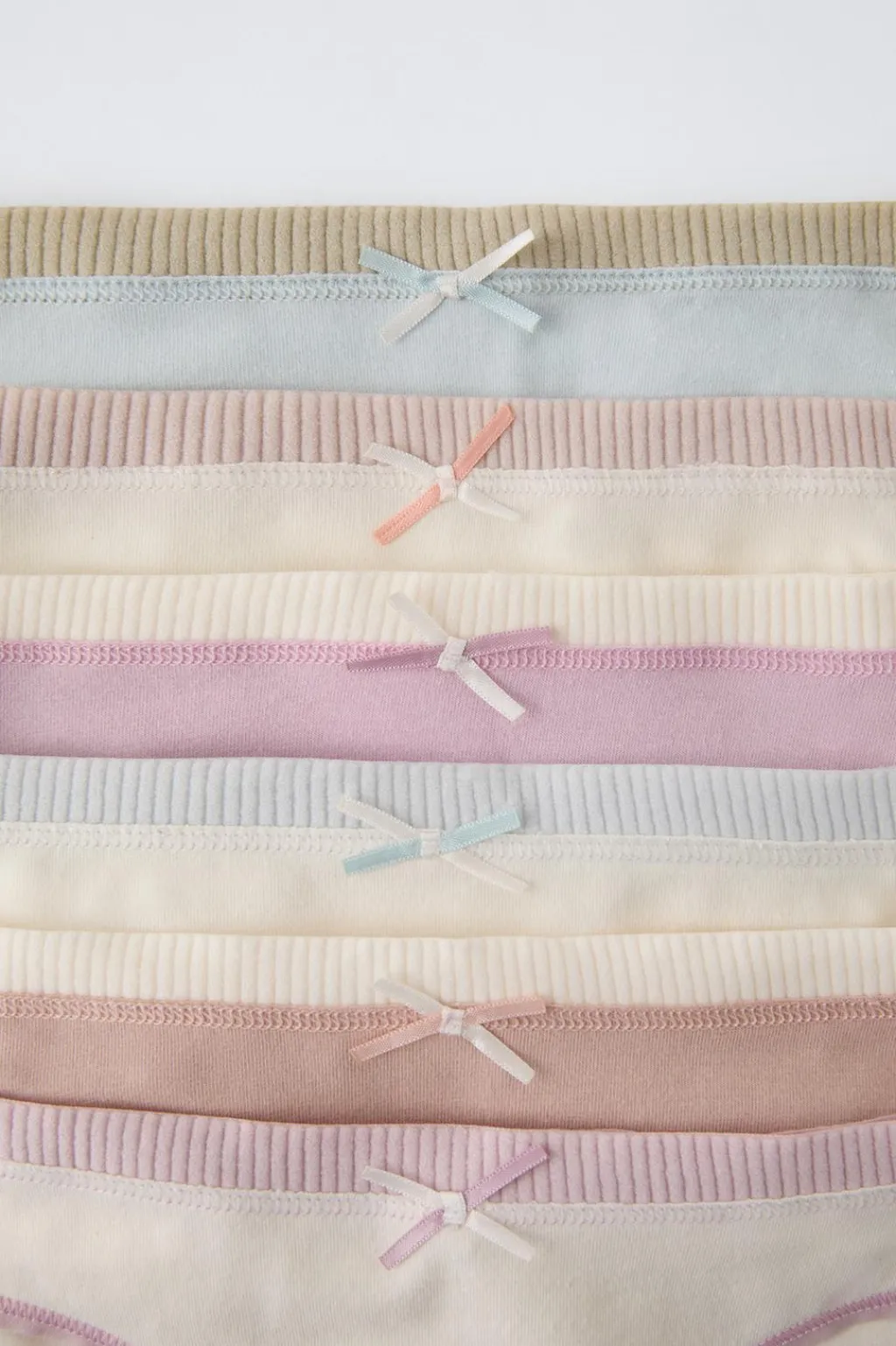 Pack de seis braguitas con cinturilla elástica. Aplique lazo frontal. Acabados en rib a contraste.