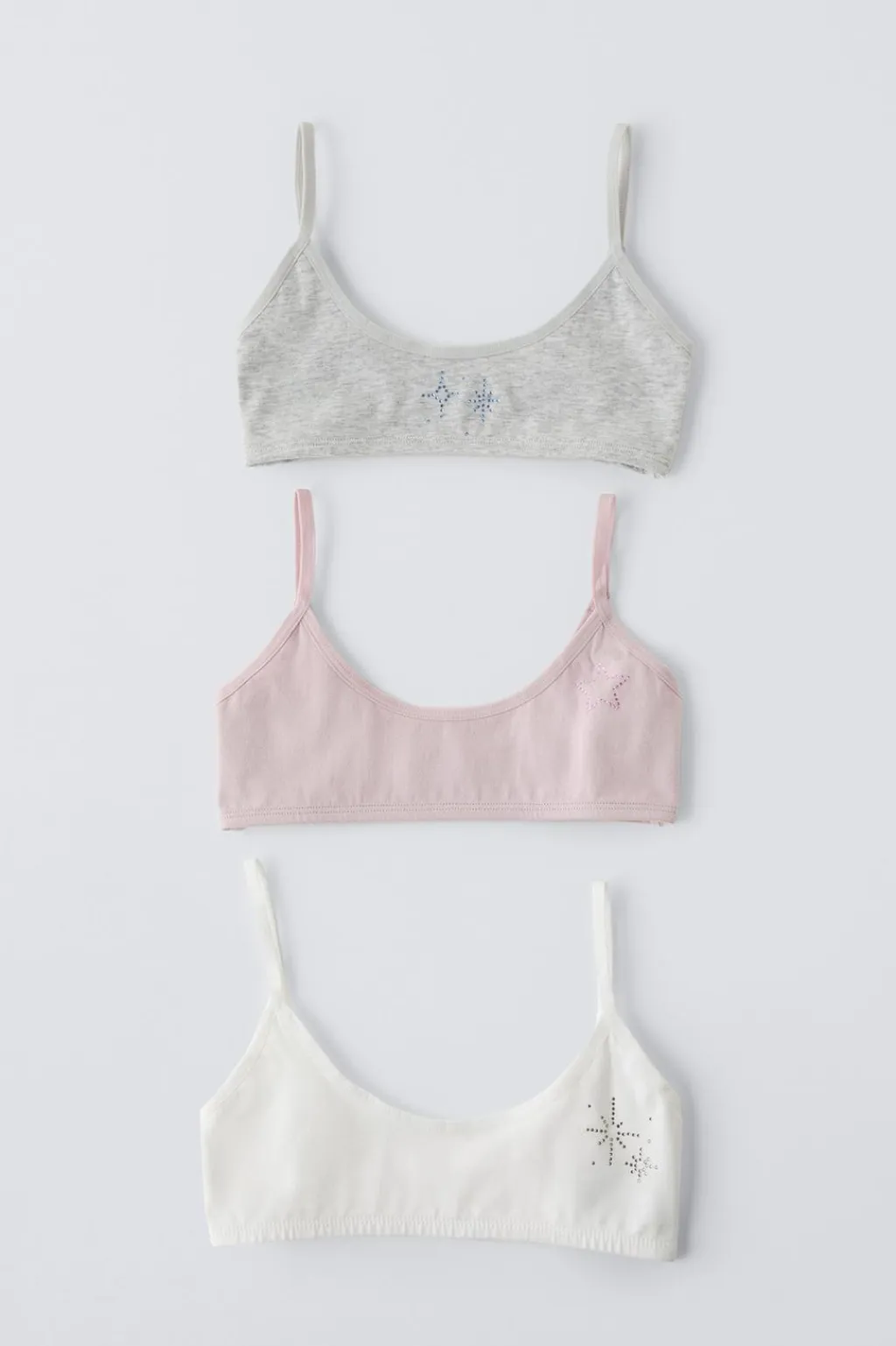 Pack de tres tops con cuello redondo y tirantes ajustables. Detalle strass en delantero con diferentes formas.
