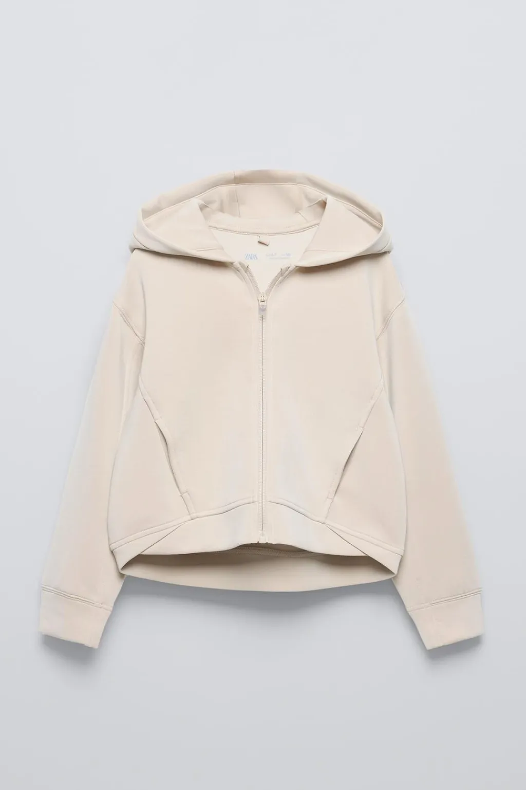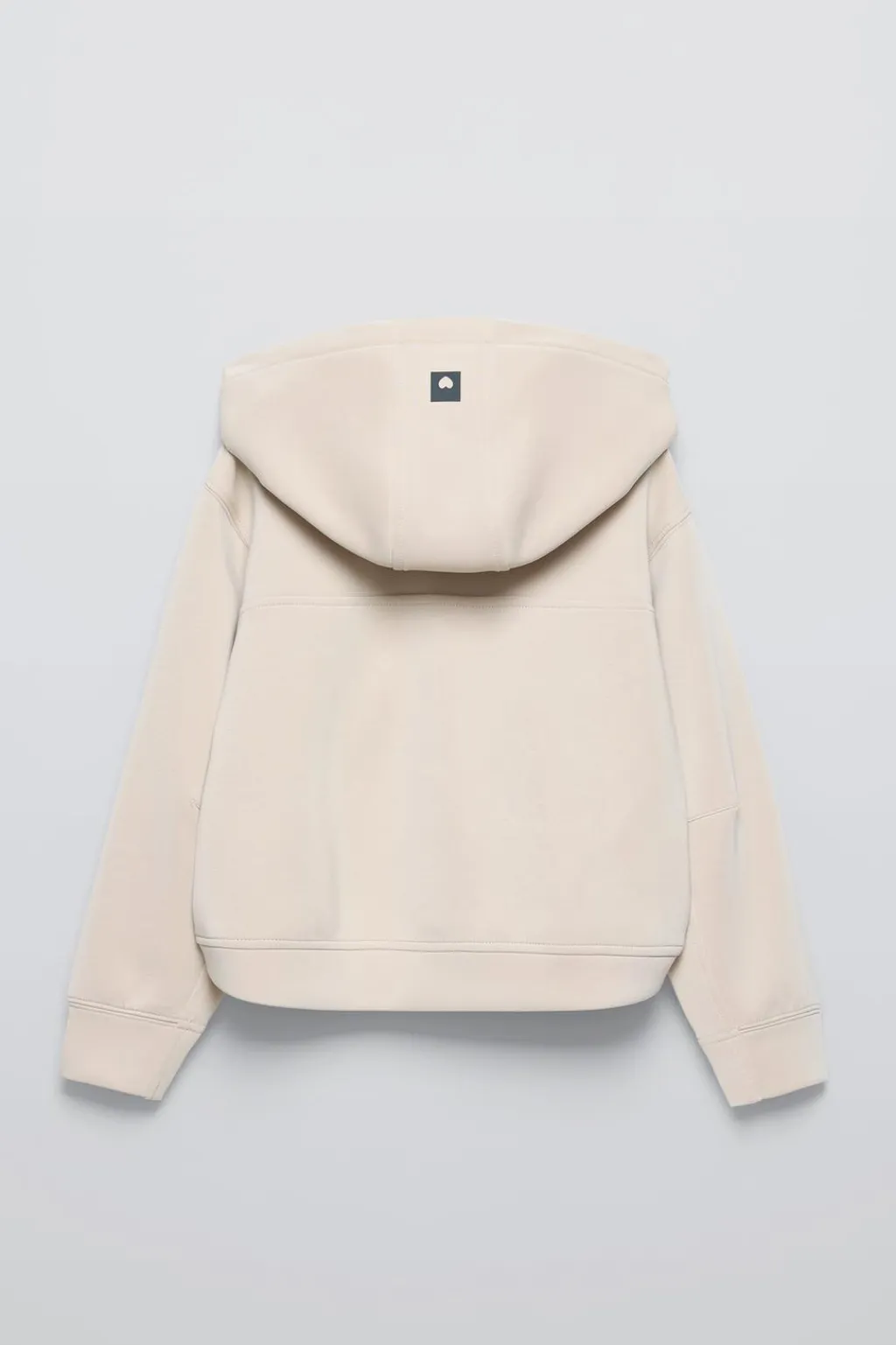 Sudadera con capucha y manga larga acabada en puño. Cierre cremallera frontal. Bolsillos delanteros. Tejido con un 38% de modal.