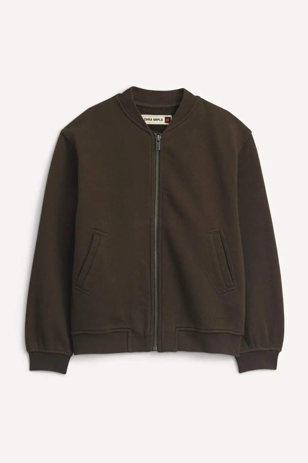 Bomber de felpa con cuello redondo y manga larga acabada en puño. Cierre de cremallera frontal. Bolsillos delanteros con detalle pespuntes. Bajo acabado en goma. Detalle texto bordado combinado a tono y etiqueta en espalda.
