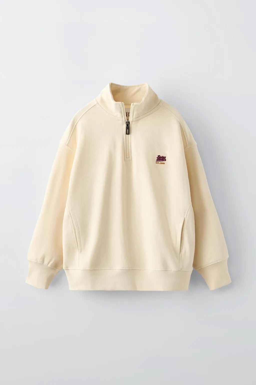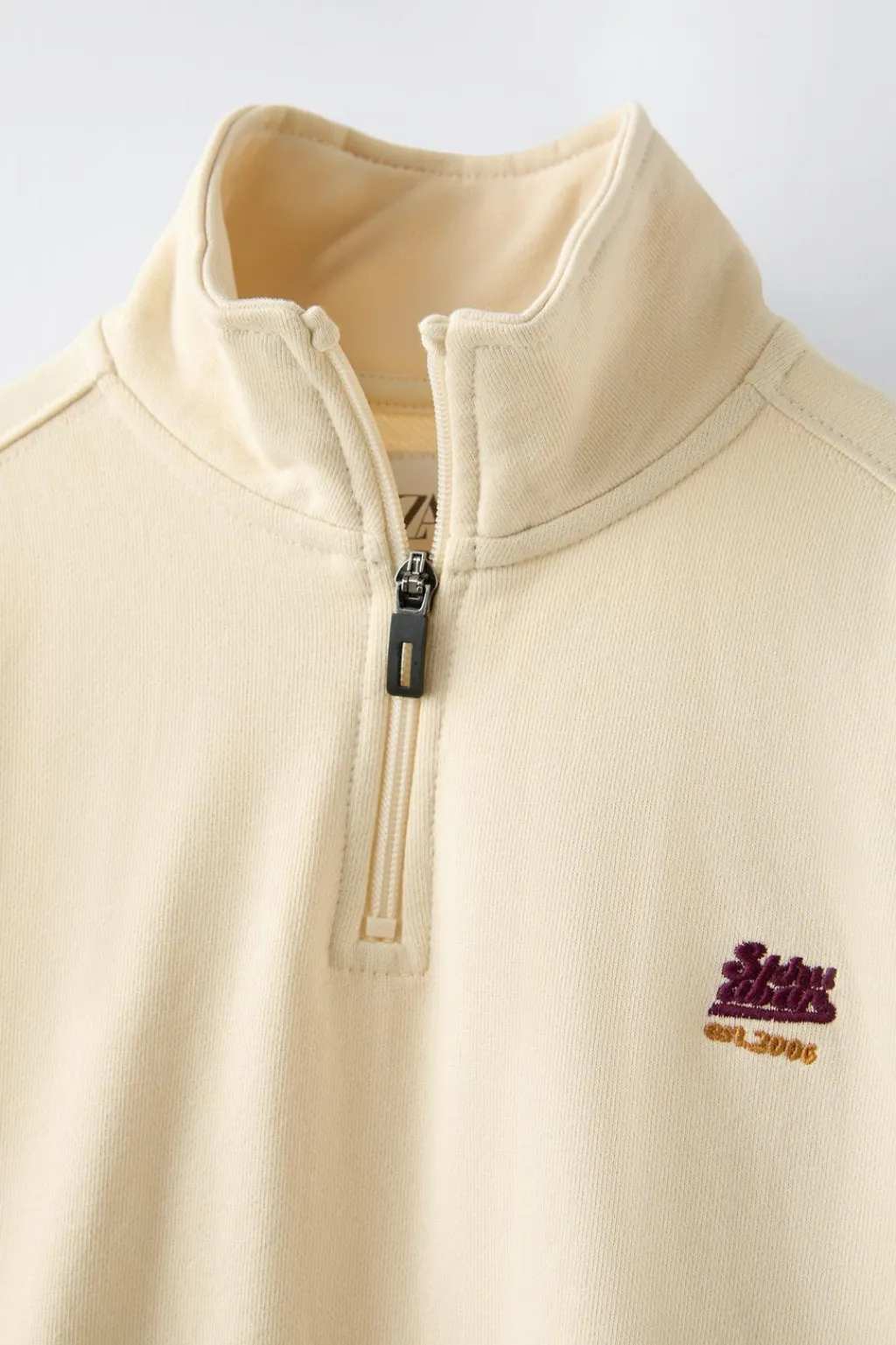 Sudadera con cuello subido y manga larga. Acabados en rib. Cierre cremallera frontal en canesú. Bolsillos delanteros con detalle vivo. Detalle texto bordado en pechera. Calidad interior cálida y suave.