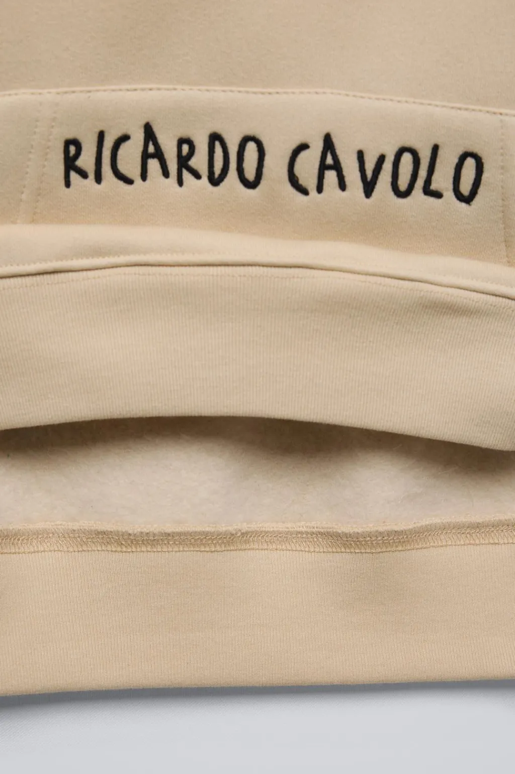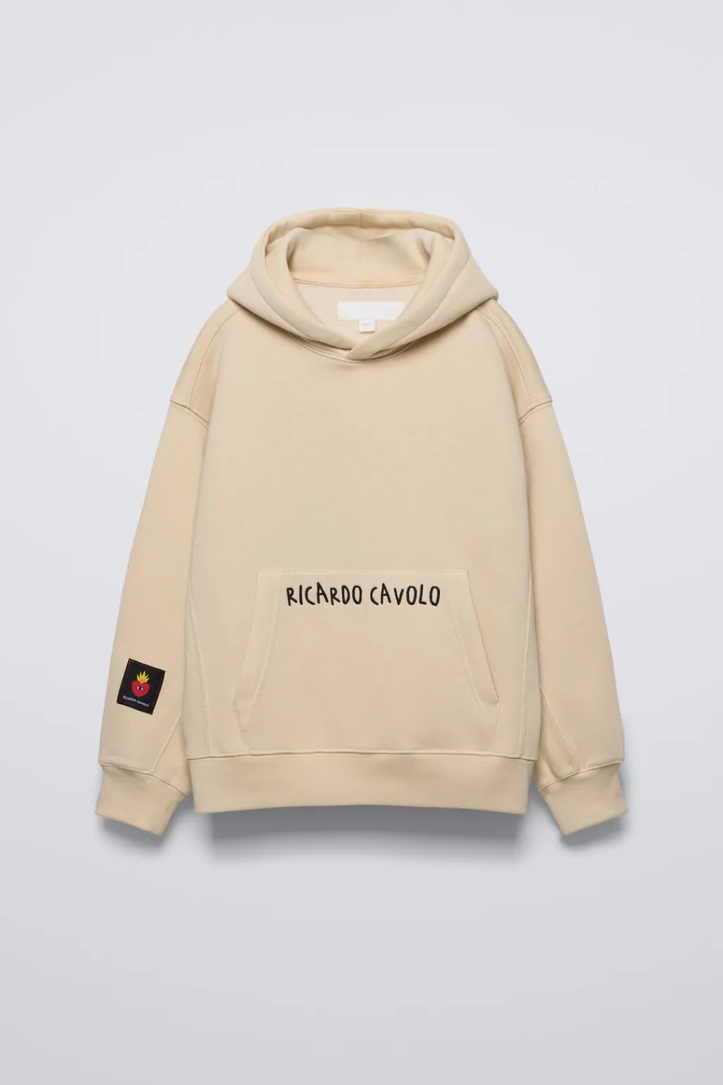 Sudadera con capucha y manga larga. Acabados en rib. Bolsillo tipo canguro con detalle bordado en delantero y estampado con relieve en espalda x Ricardo Cavolo. Aplique etiqueta en manga.
