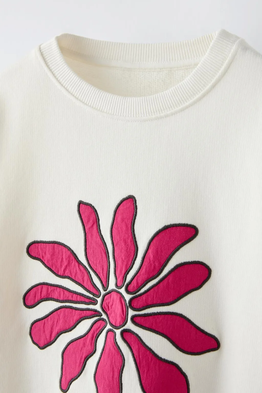 Sudadera con cuello redondo y manga larga. Detalle flor con bordado y estampado en delantero. Acabados en rib.