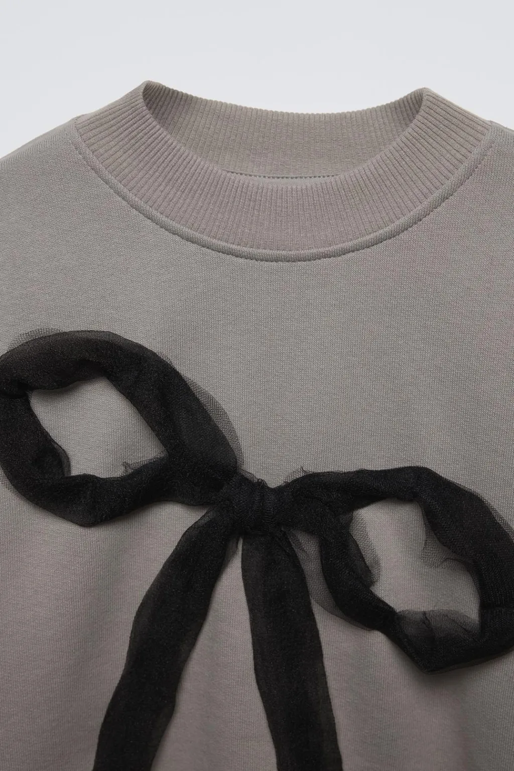 Sudadera con cuello redondo y manga larga. Acabados en rib. Aplique lazo de tul en delantero. Calidad interior cálida y suave.