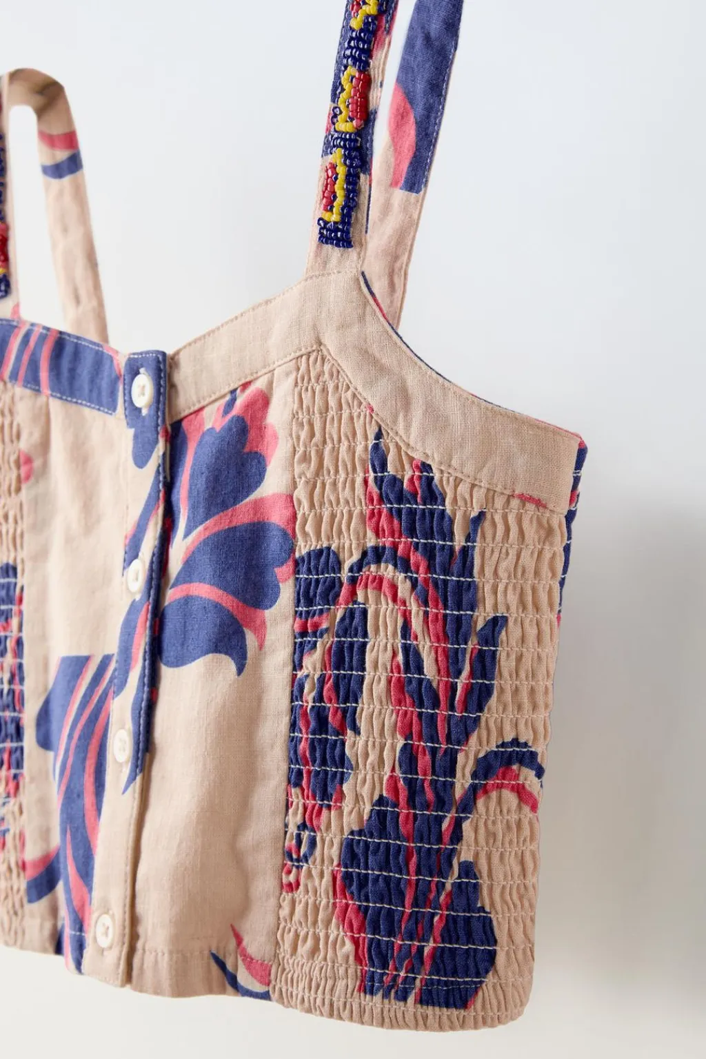Top con cuello recto y tirantes con aplique abalorios. Cierre con botonadura frontal. Detalle gomas en es laterales.