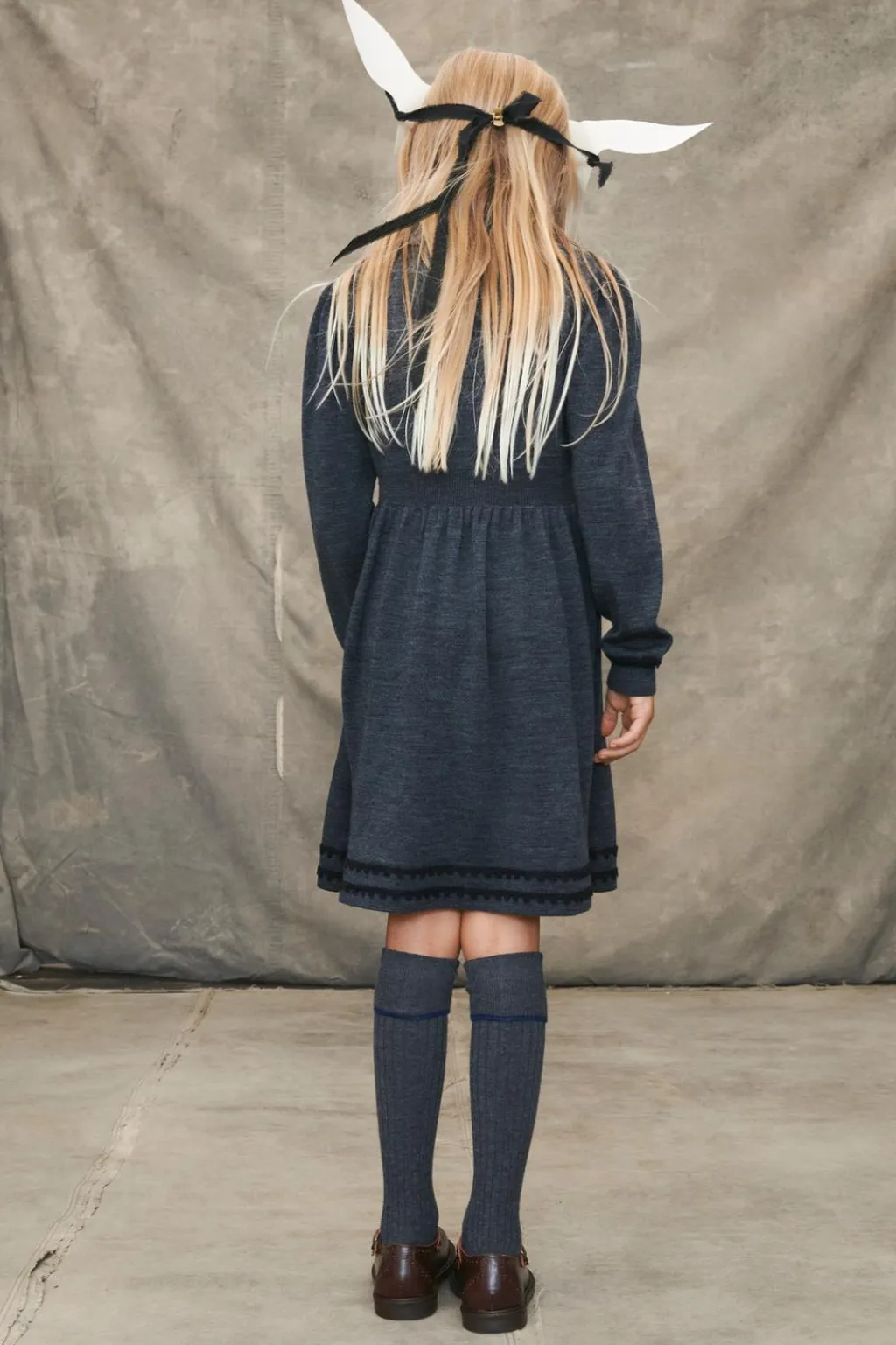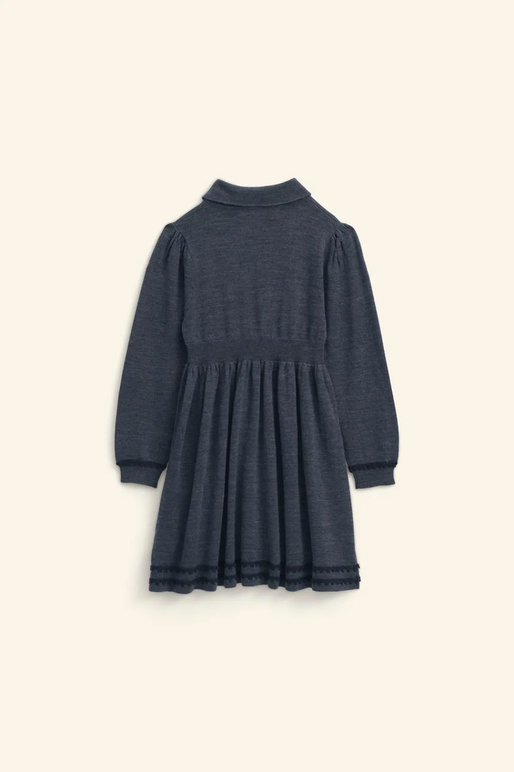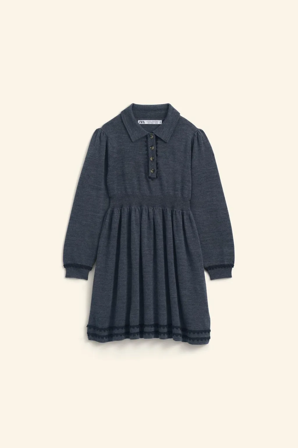 Vestido de lana con cuello camisero y manga larga acabada en puño. Cierre botonadura frontal en canesú. Detalle goma elástica en cintura. Aplique cenefas en bajo, puño y pechera.
