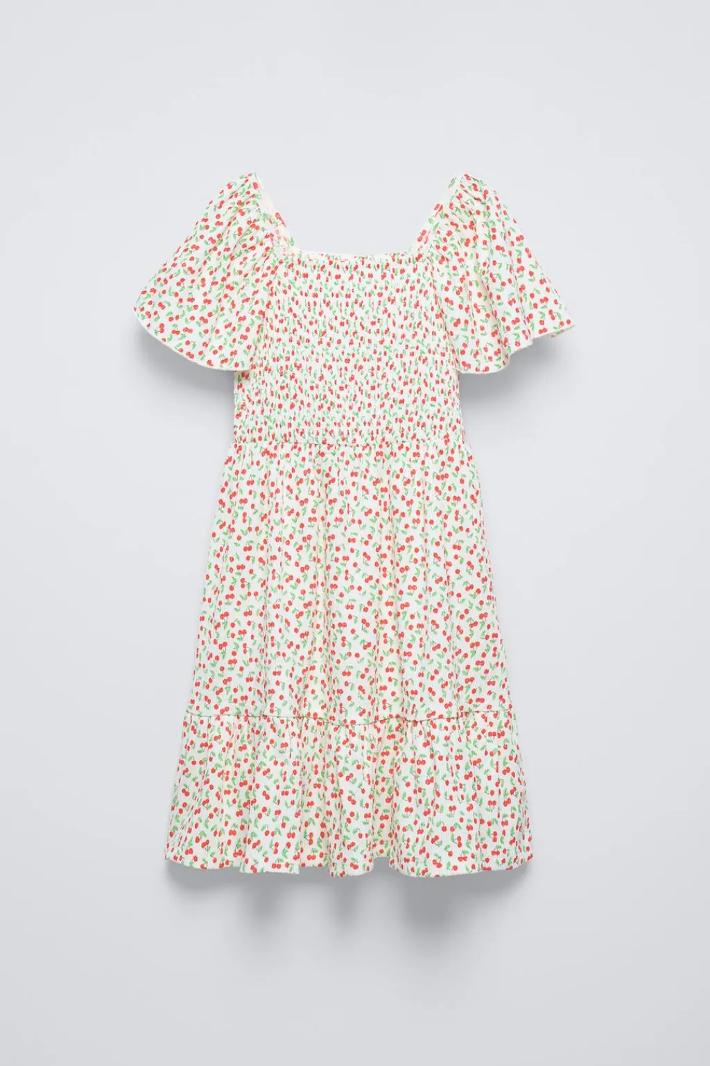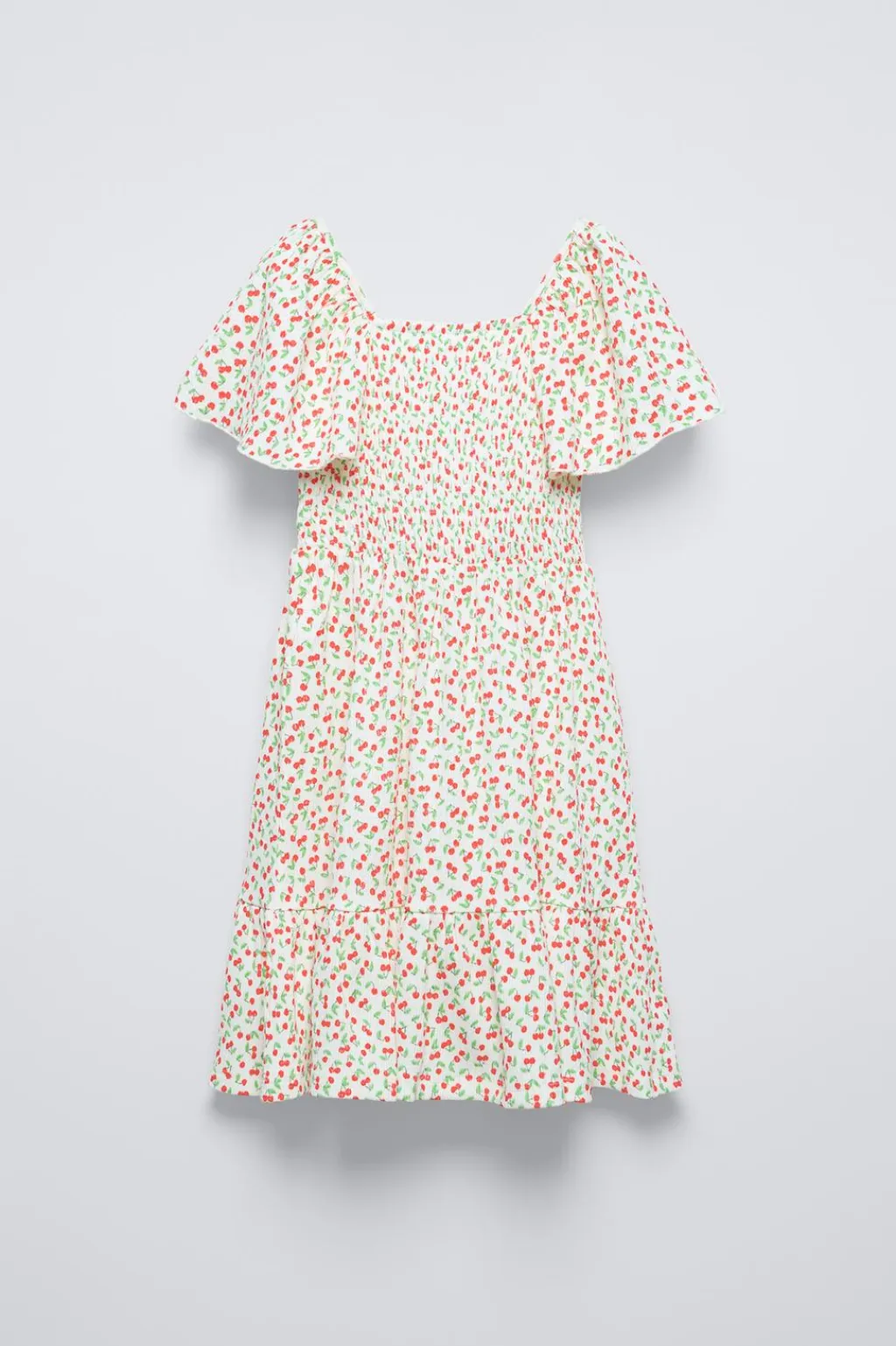 Vestido con cuello recto y manga corta acabada en volante. Detalle goma en delantero y espalda.
