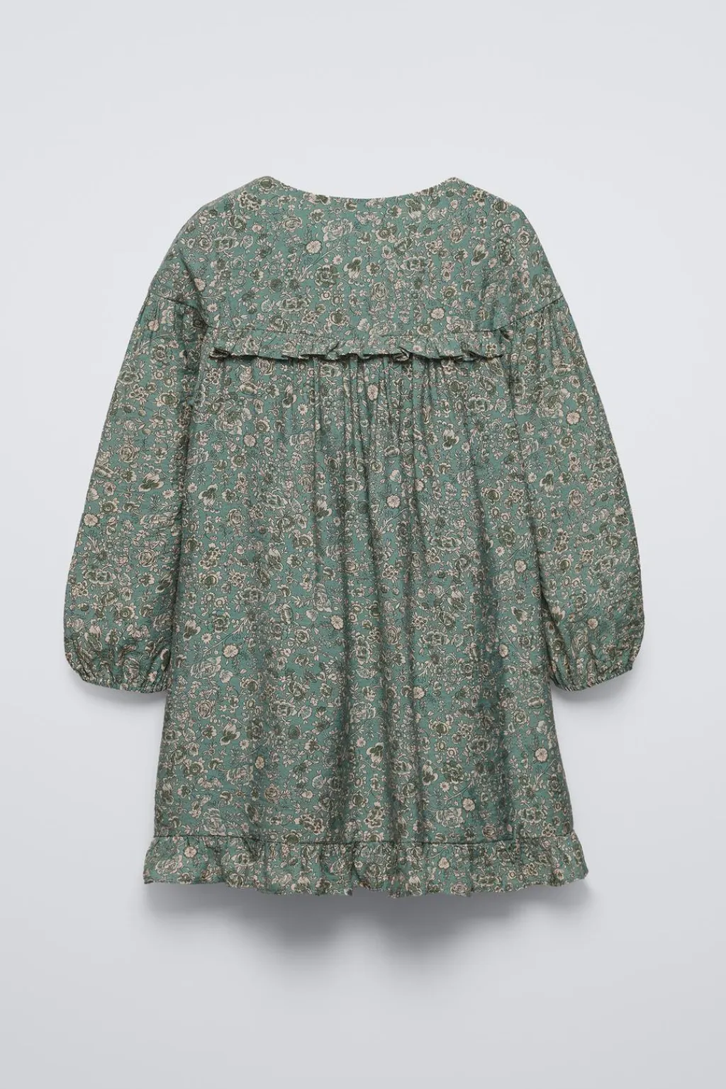 Vestido con cuello redondo y manga larga acabada en goma. Detalle volantes y aplique lazos en pechera.