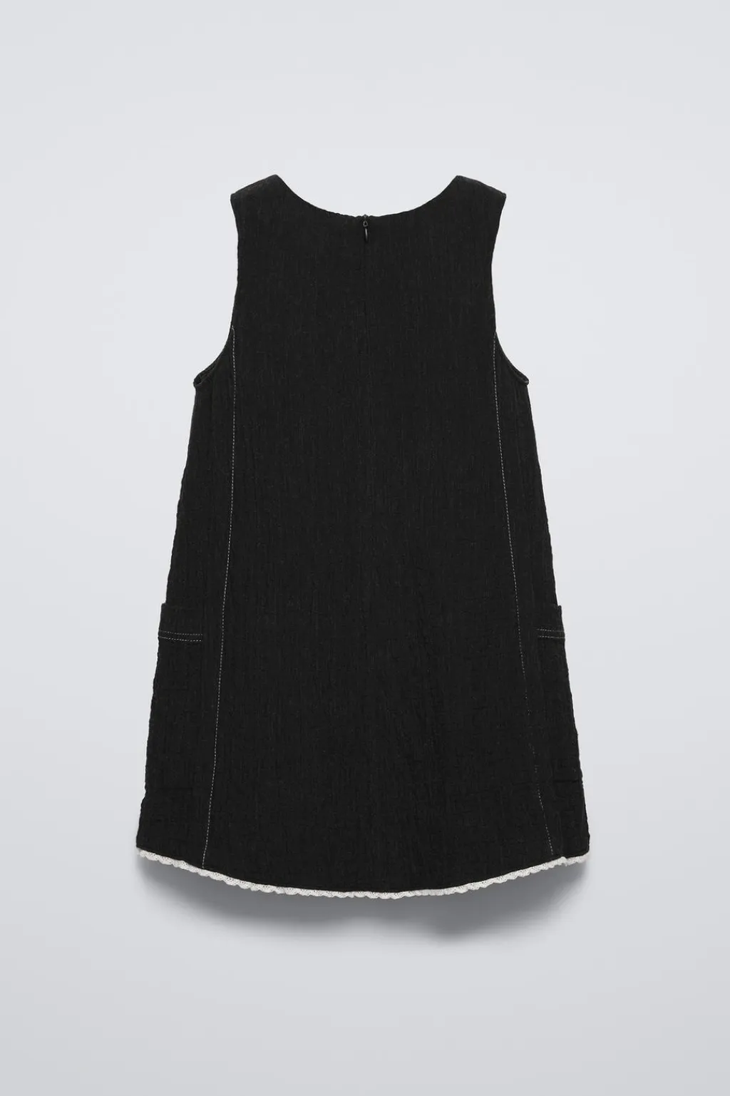 Vestido con cuello redondo y manga sisa. Cierre cremallera oculta en espalda. Bolsillos de tipo plastrón en laterales. Aplique puntilla en pechera y bajo. Detalle pespuntes color a contraste.