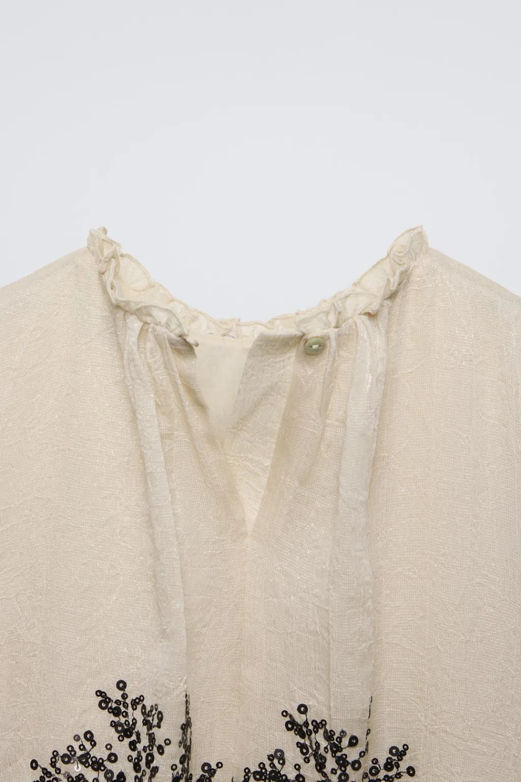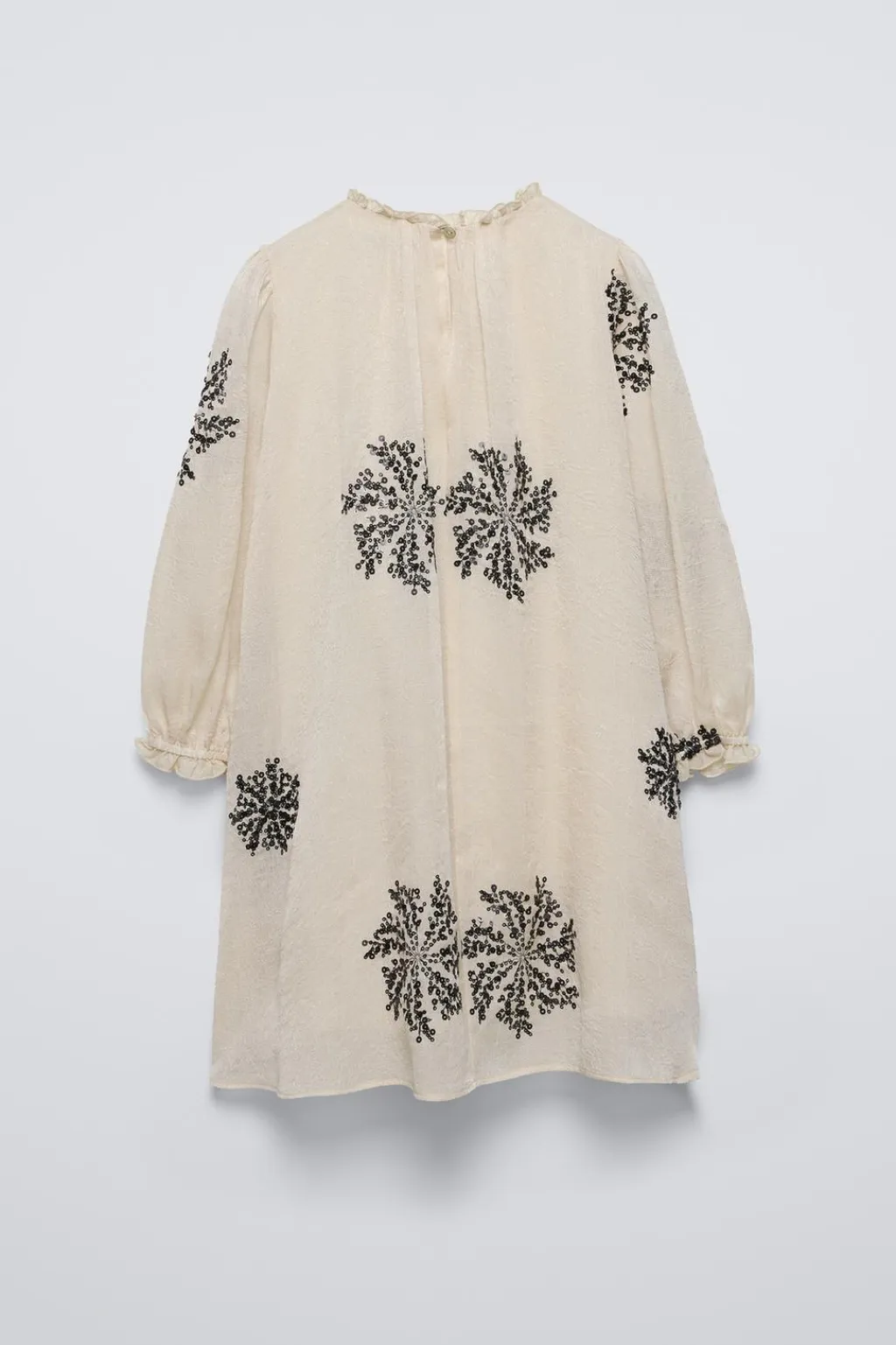 Vestido con cuello redondo y manga larga acabado en goma. Cierre tipo lágrima con botón en espalda. Aplique lentejuelas en formas. Forro interior combinado a tono.