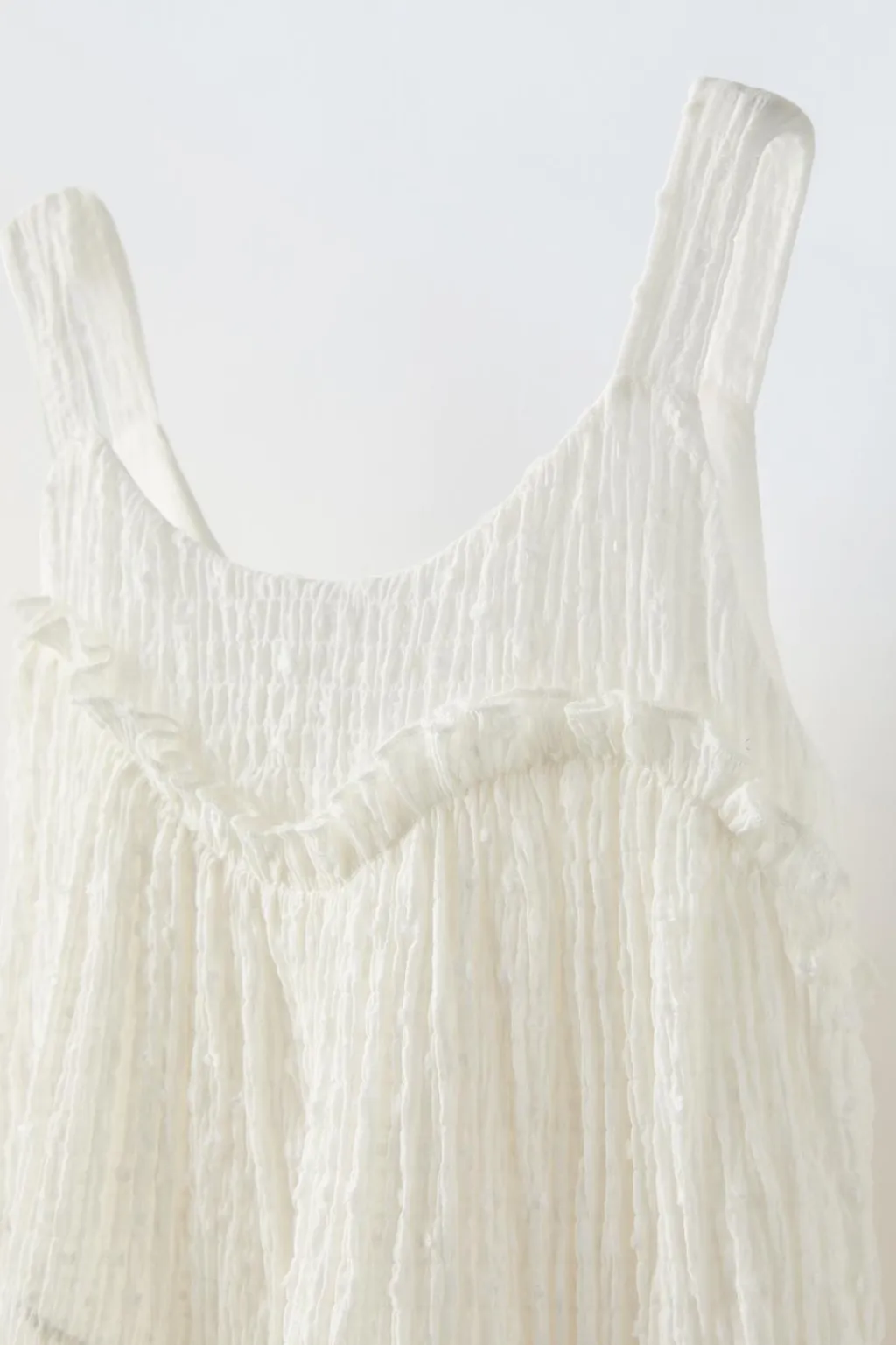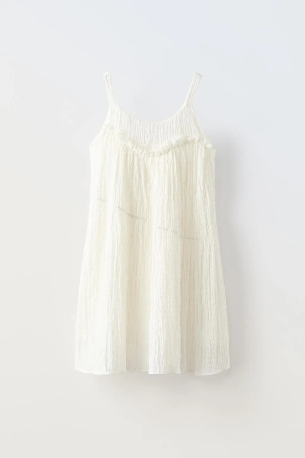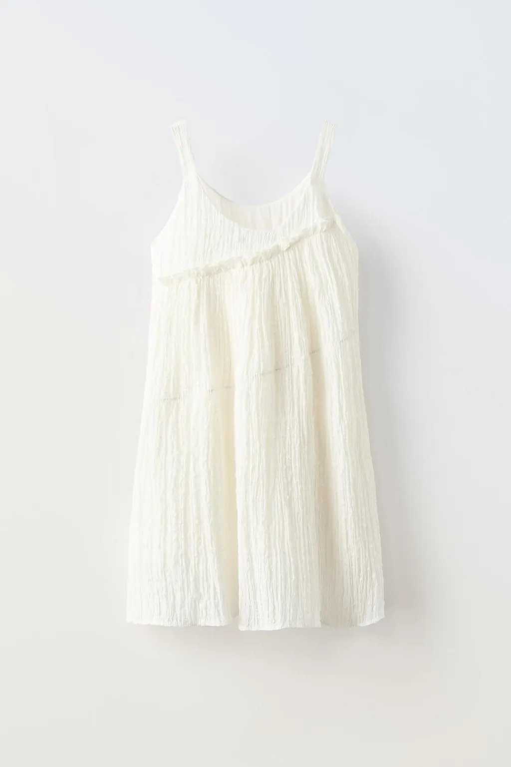 Vestido con cuello redondo y tirantes. Detalle rizo asimétrico en delantero.
