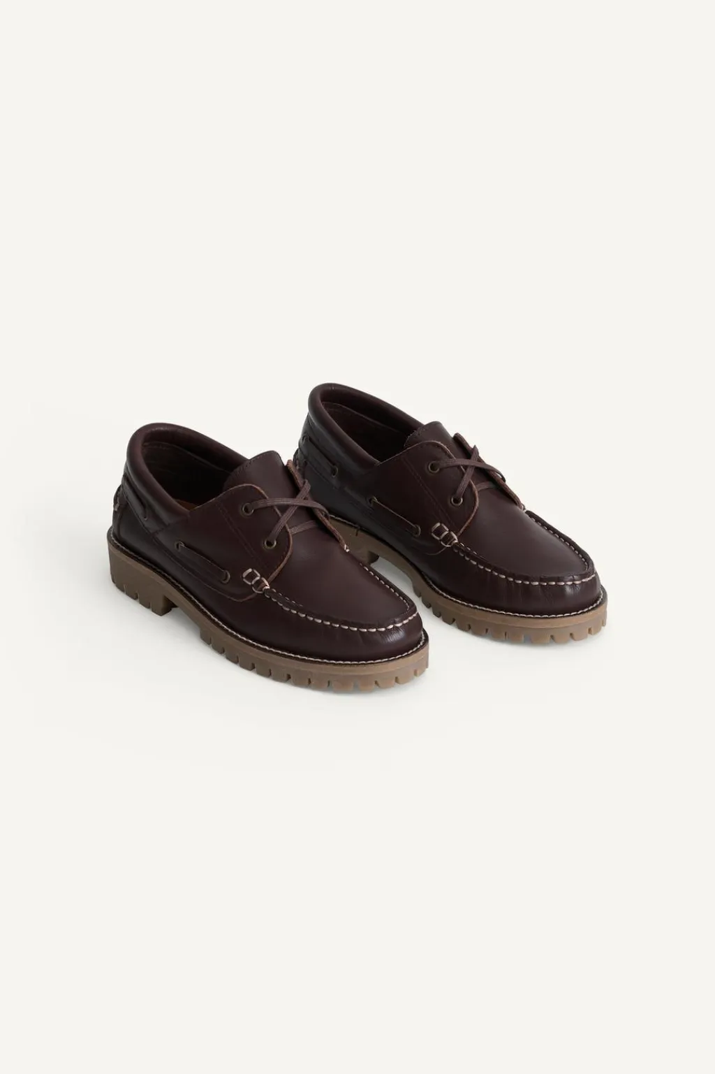 Zapato tipo mocasín náutico 100% piel vacuno. Cierre mediante cordones ajustables. Detalle de continuación del cordón en el lateral del corte. Plantilla flexible 100% piel ovina. Forro interior 100% piel vacuno. Suela de goma dentada.
