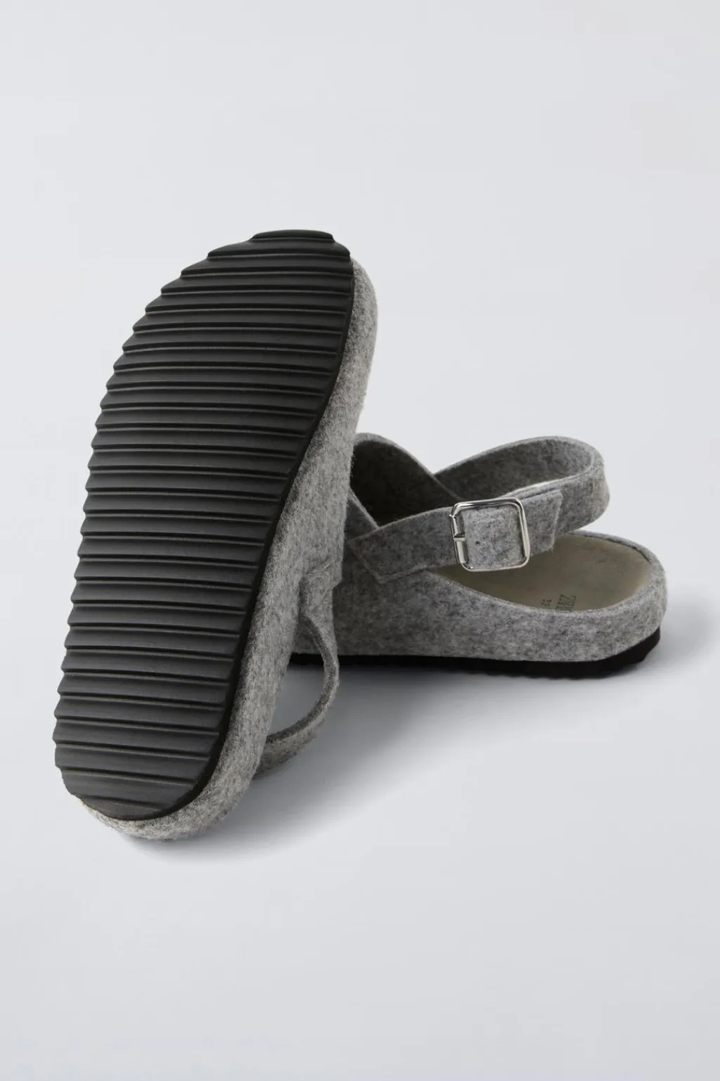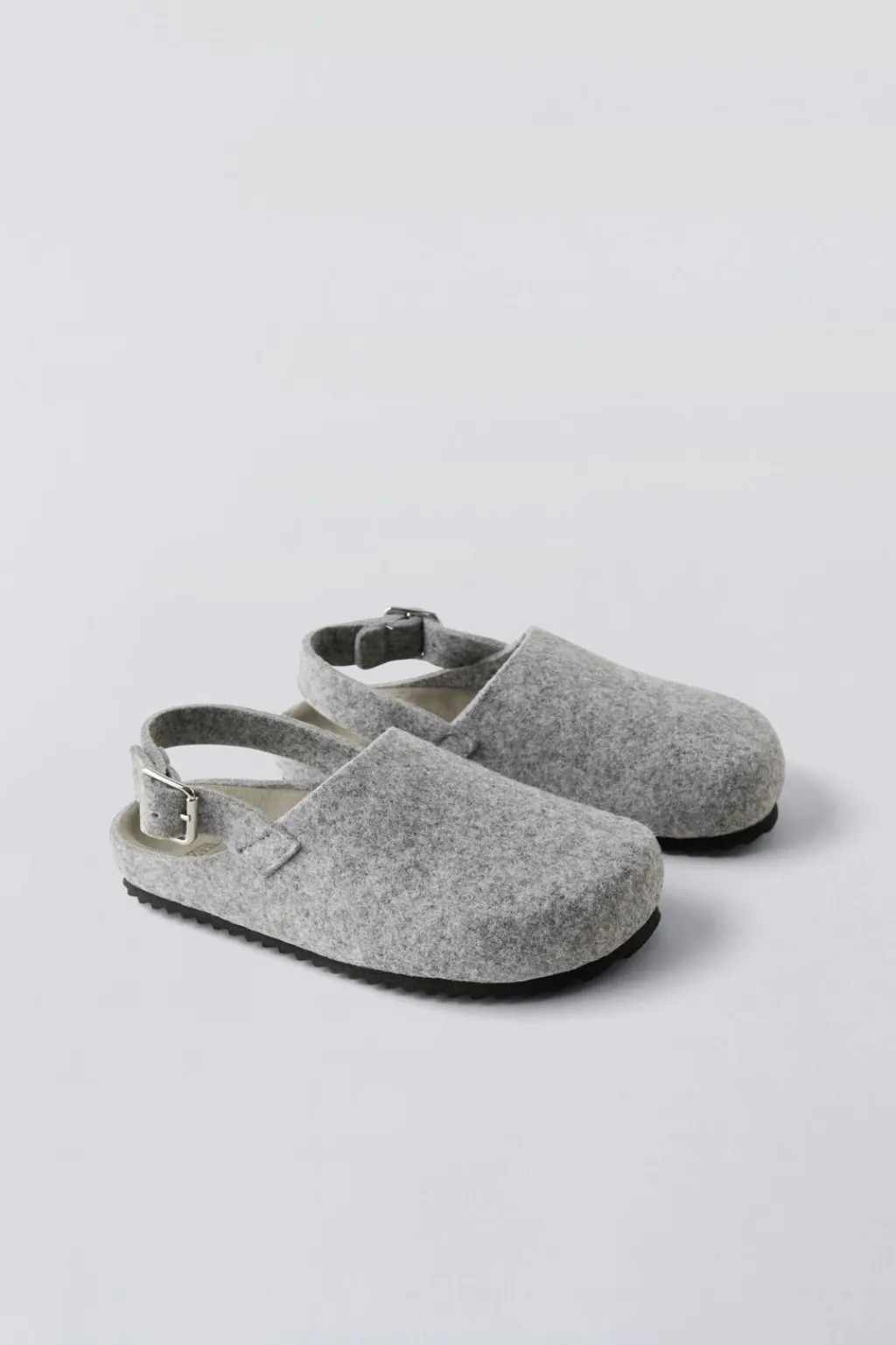 Zapato home tipo zueco de fieltro. Cierre mediante hebilla trasera. Suela de goma.