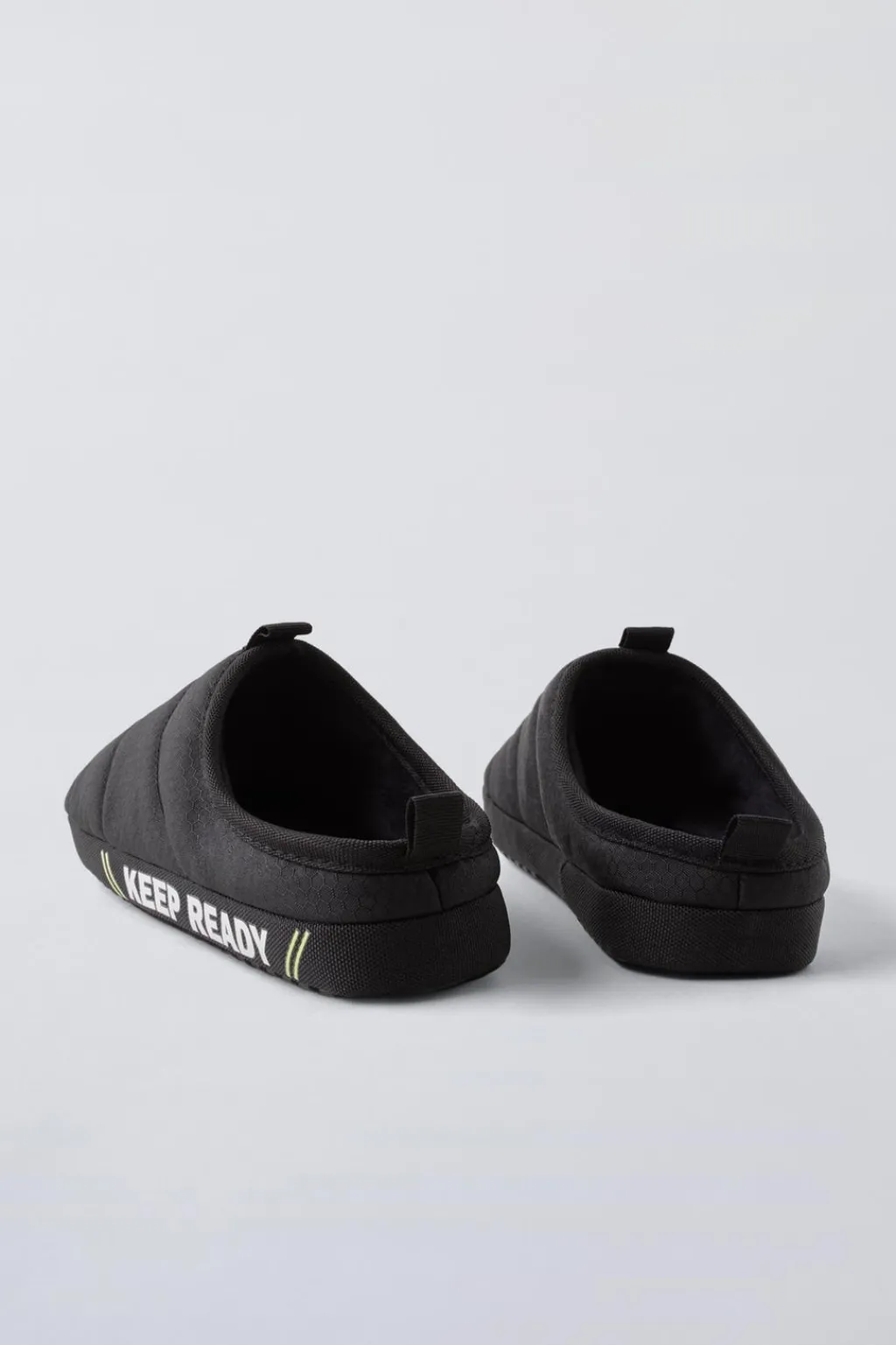 Zapatillas de casa con detalle texto. Tirador trasero y delantero para facilitar el calce. Suela de goma.