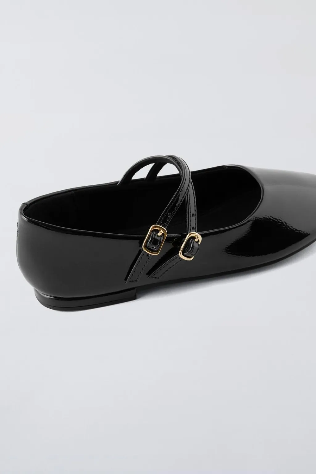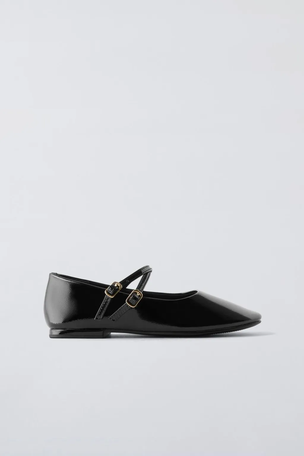 Zapato tipo bailarina acharolada. Doble tira con cierre mediante hebilla. Plantilla flexible. Suela de goma.