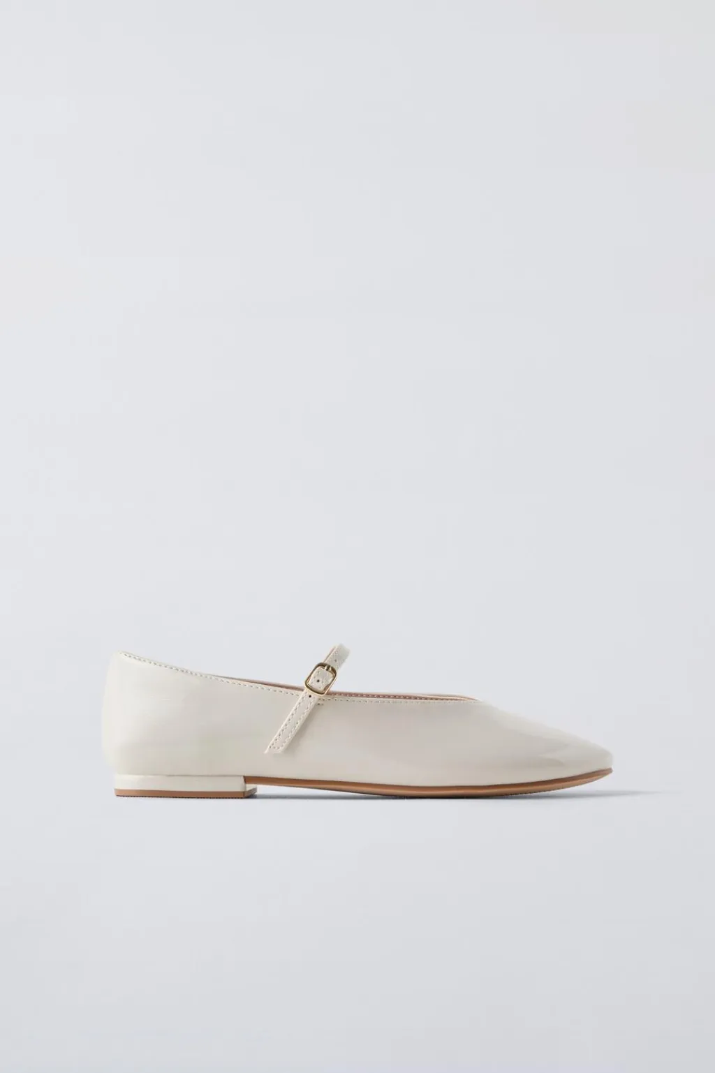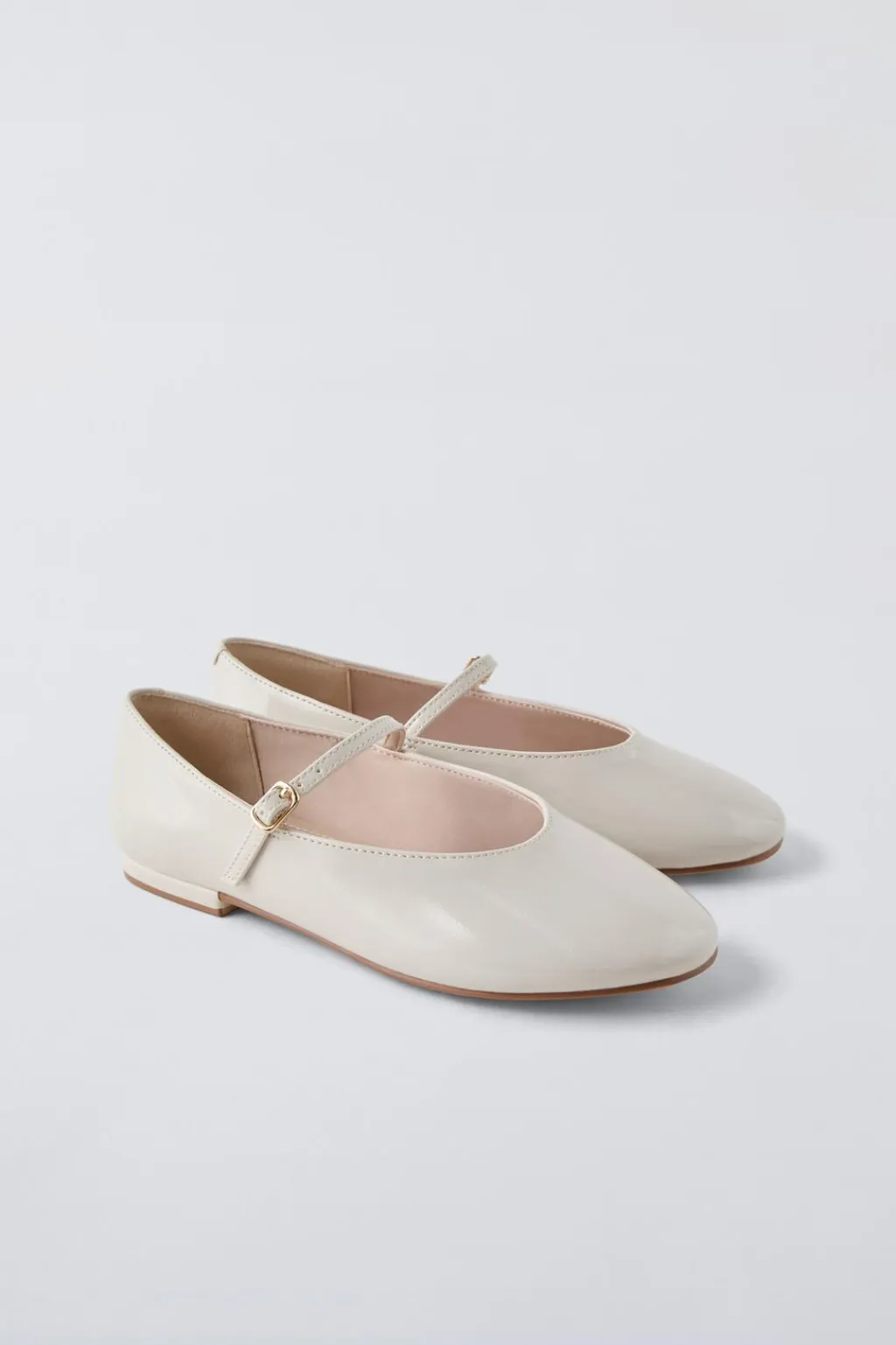 Zapato tipo bailarina acharolada. Cierre mediante hebilla lateral. Plantilla flexible. Suela de goma.