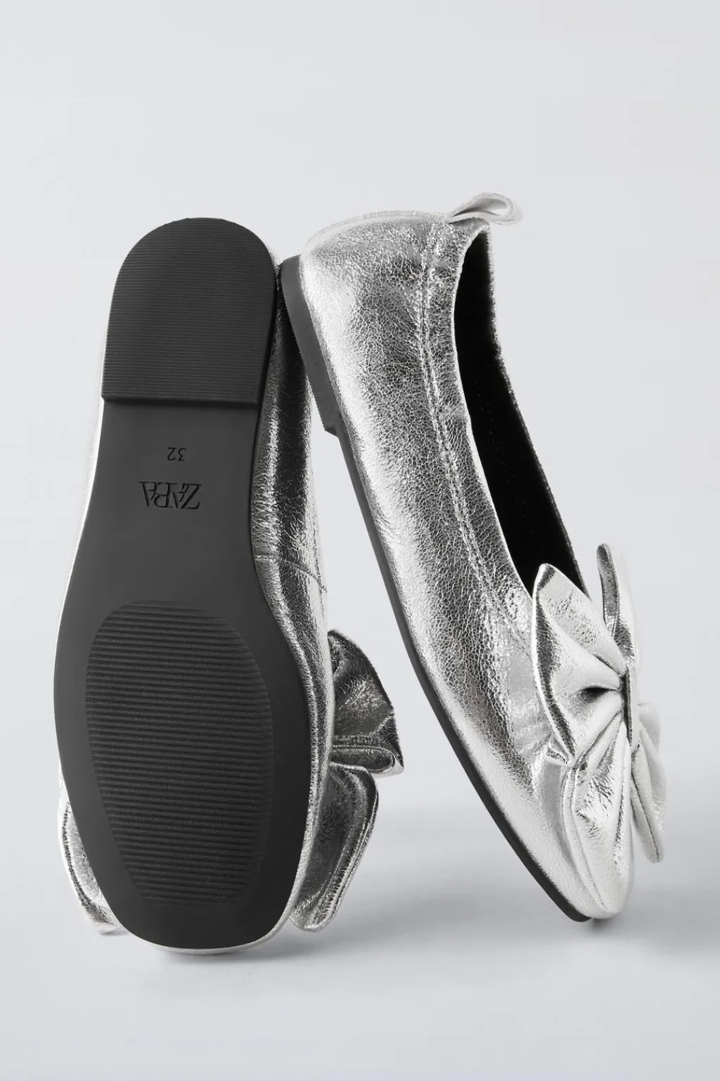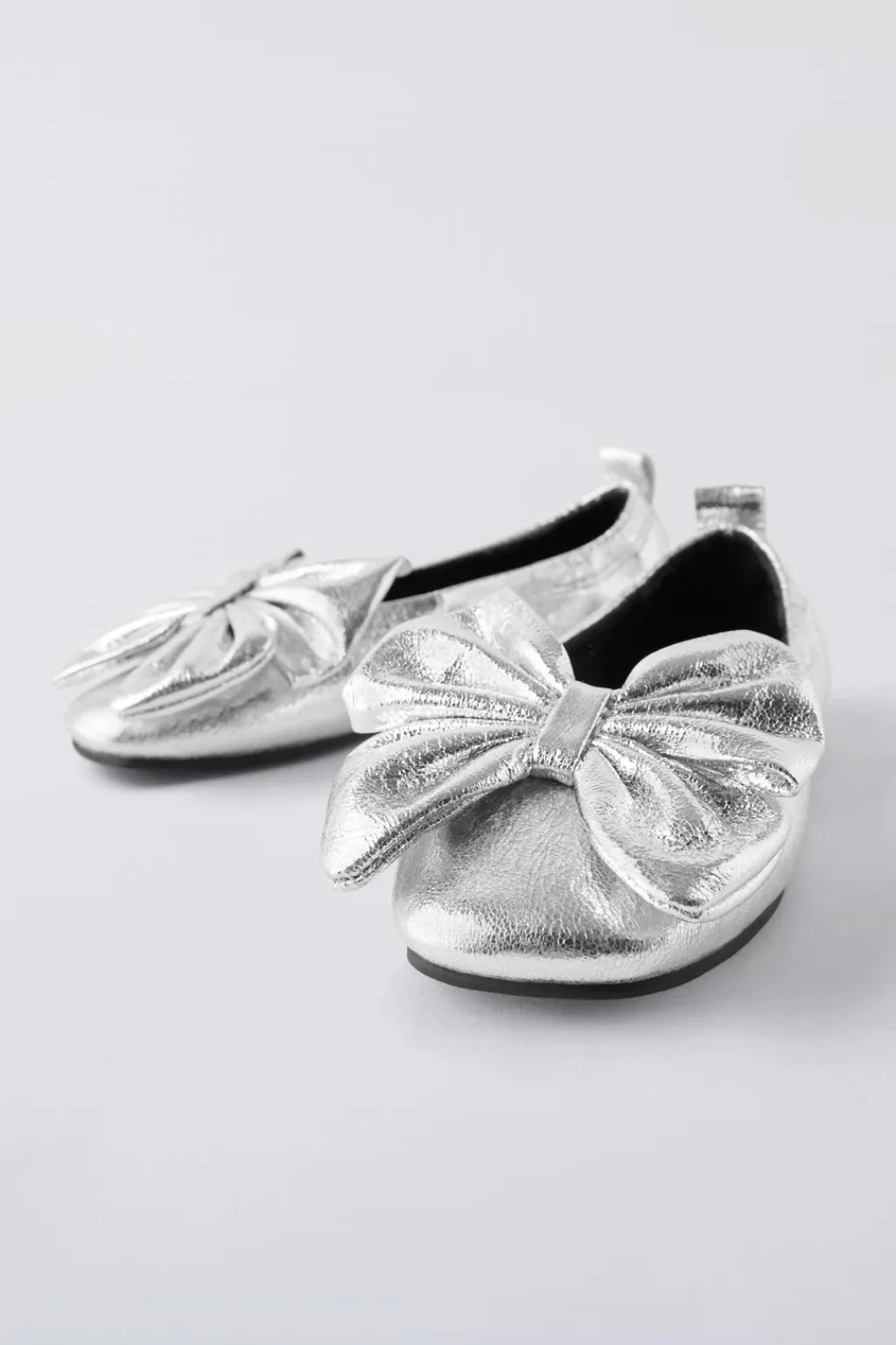 Zapato tipo bailarina con acabado metalizado y detalle de maxi lazo en el empeine. Tirador trasero para facilitar el calce. Plantillaflexible. Suela de goma.