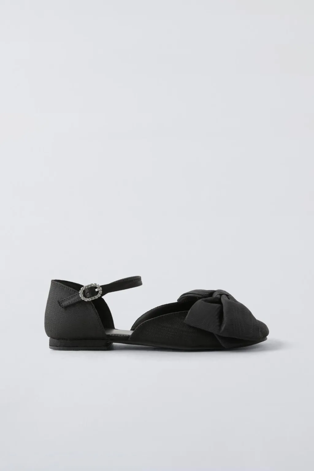 Zapato tipo bailarina con detalle de maxi lazo en el empeine. Cierre mediante hebilla lateral con detalle de strass. Plantilla flexible. Suela de goma.