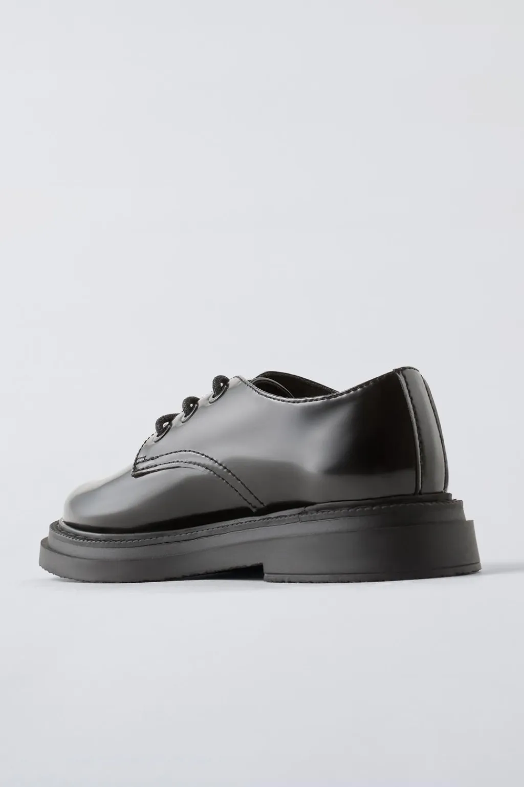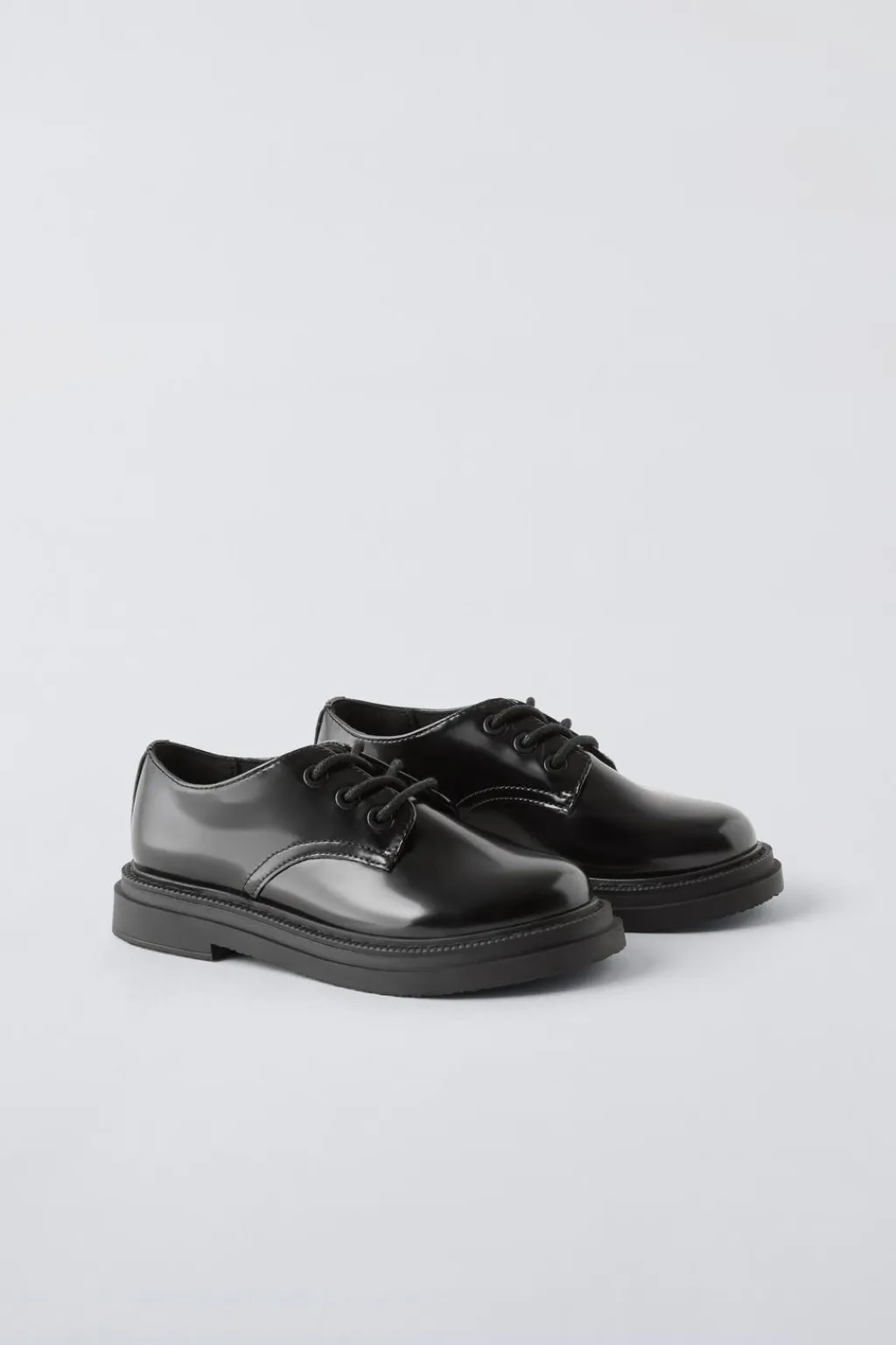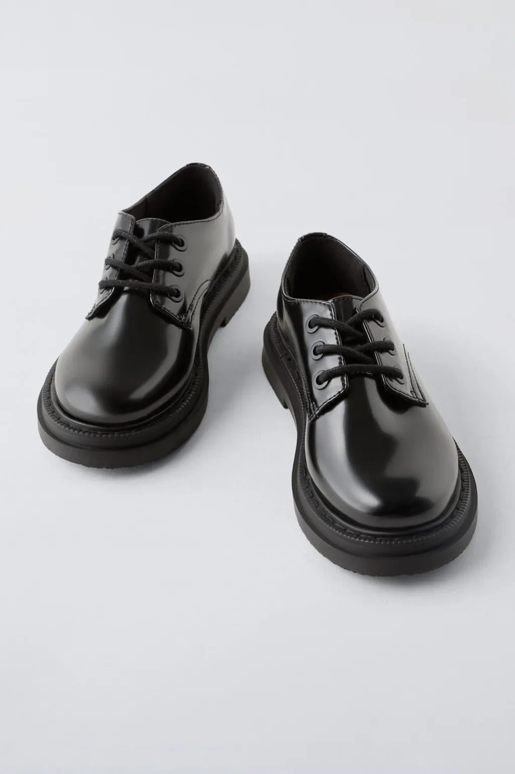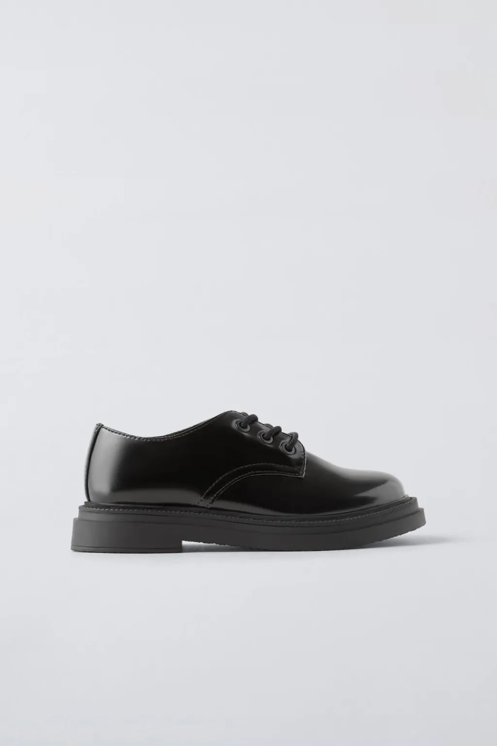 Zapato tipo blucher con cierre mediante cordones y efecto acharolado. Plantilla flexible. Suela de goma.